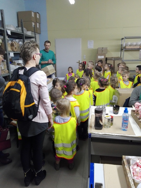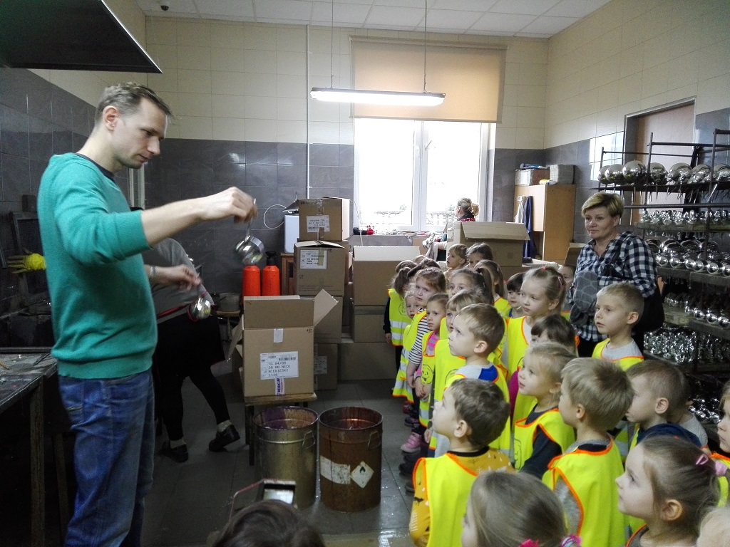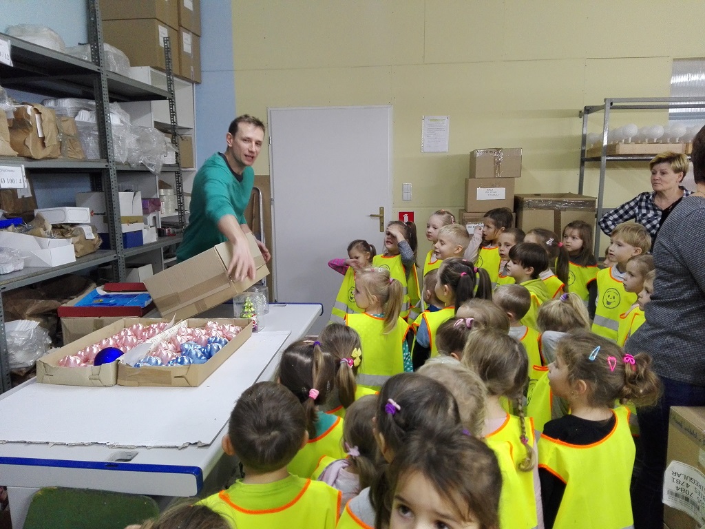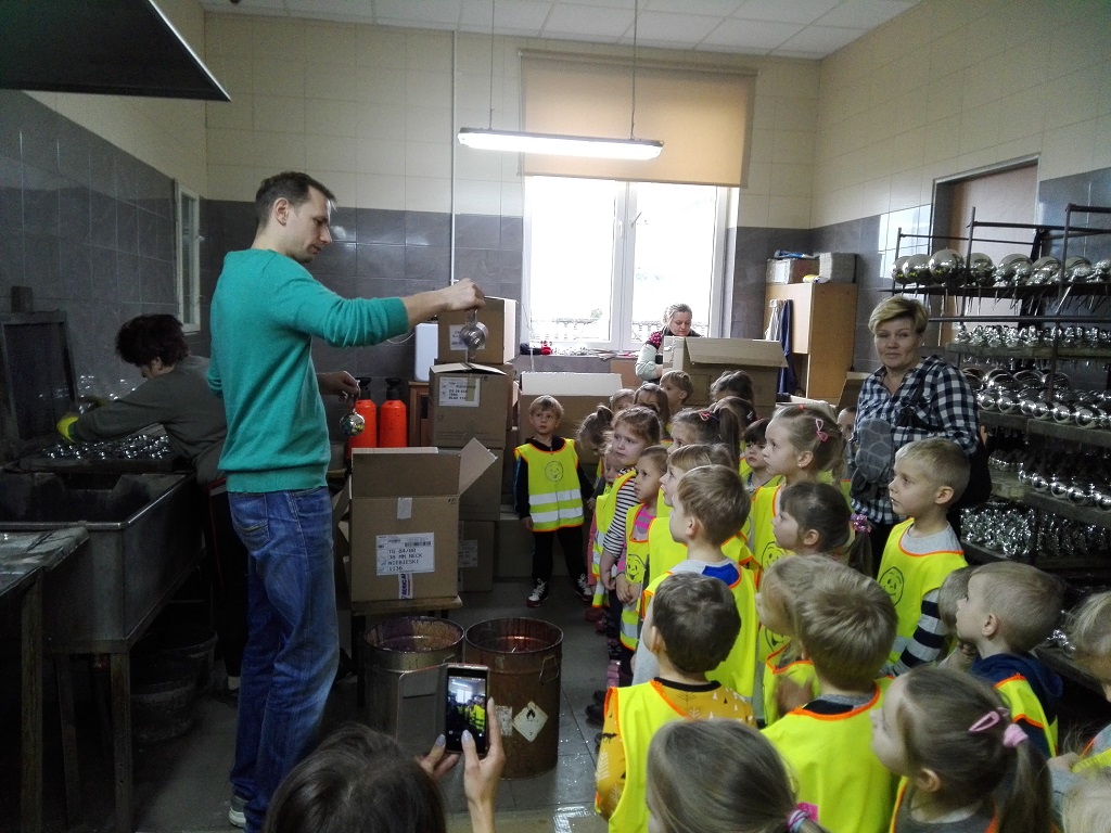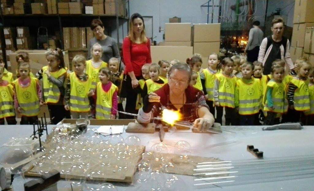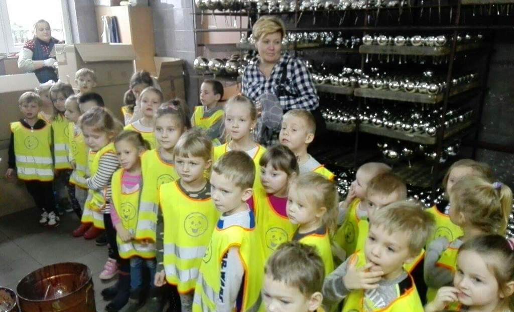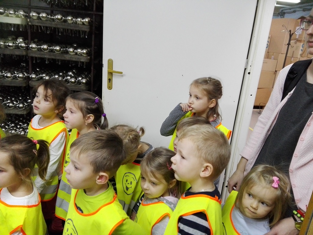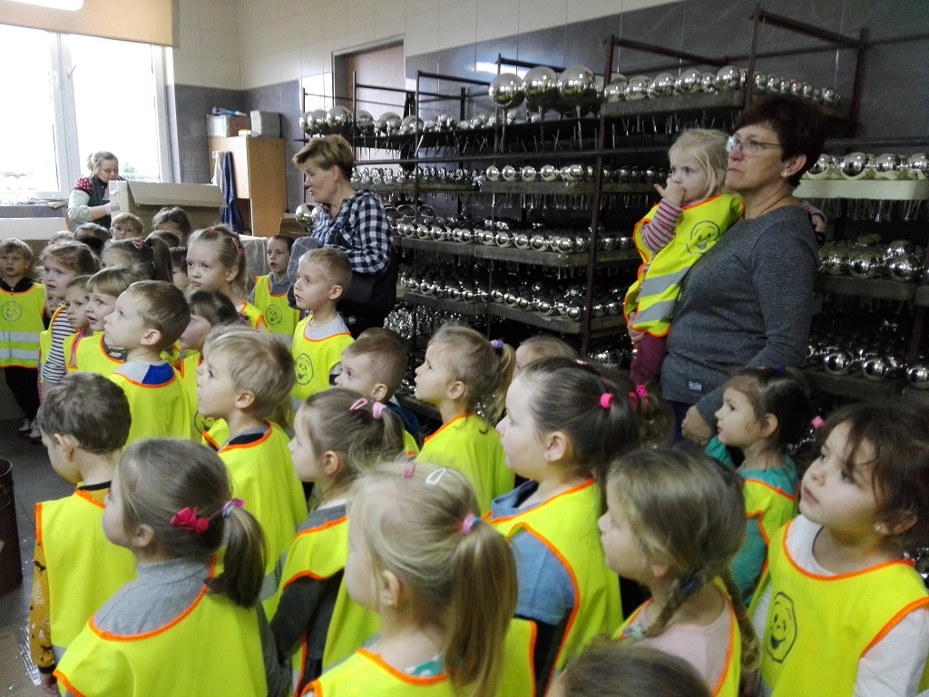 Nasze przedszkolaki zwiedziły fabrykę razem z przewodnikiem, który opowiedział im o etapach powstawania szklanych ozdób. Dzieci zobaczyły "dmuchalnię", gdzie przy użyciu palników formowane są szklane kule, następnie zostały zapoznane z procesem srebrzenia bombek, jednak największe wrażenie zrobiła na dzieciach dekoratornia, gdzie mogły zaobserwować proces ozdabiania przygotowanych bombek. Na koniec przedszkolaki obejrzały gotowe już do sprzedaży bombki w firmowym sklepie.