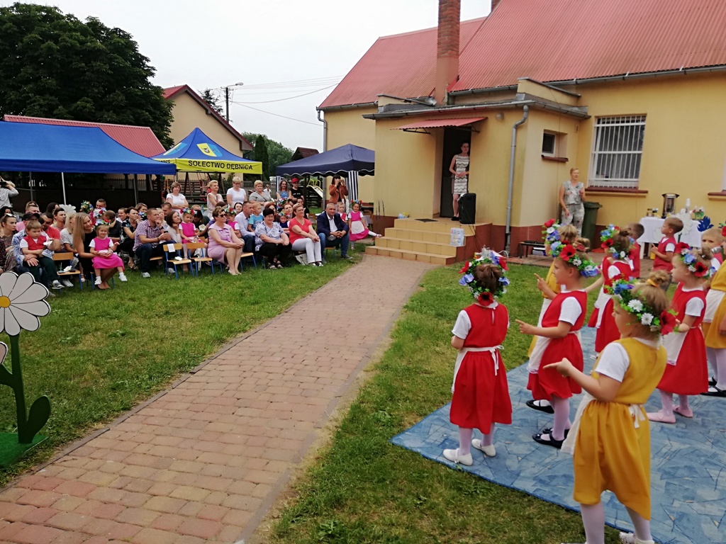 W ramach realizacji zadania publicznego nasze przedszkolaki od kwietnia brały udział w profesjonalnych warsztatach tanecznych, podczas których poznawały wielkopolskie tańce i zabawy ludowe m.in. Czyżyk, Maryneczka, Kłaniany, Ceglorz, Kowal. Zajęcia warsztatowe odbywały się w każdym tygodniu i były prowadzone przez choreografa tańca z Gminnego Ośrodka Kultury w Przygodzicach - p. Agatę Niedzielską oraz nauczycielki przedszkola. Zaplanowany na początek czerwca Festiwal Tańca był podsumowaniem działań warsztatowych. Przedszkolaki zaprezentowały przygotowane tańce przed swoimi rodzicami i zaproszonymi gośćmi: p. Wiesławą Zawada - Sołtysem wsi Dębnica, p. Lucyną Gorzyczką i p. Mariuszem Harychem - radnymi wsi Dębnica, p. Dariuszem Spychalskim - Prezesem Stowarzyszenia Na Rzecz Rozwoju Wsi Dębnica oraz p. Agatą Niedzielską - choreografem tańca. Dzieci wystąpiły w pięknych strojach, których zakup był możliwy dzięki pozyskanym na ten cel środkom pieniężnym na realizację zadania publicznego. Po zakończonej prezentacji tańców wielkopolskich p. Dyrektor Aurelia Poprawa wręczyła podziękowania za pomoc w realizacji projektu "W Dolinie Baryczy tańcujemy" dla p. Agaty Niedzielskiej, p. Roberta Kaczmarka (Dyrektora Gminnego Ośrodka Kultury w Przygodzicach) i p. Dariusza Spychalskiego.