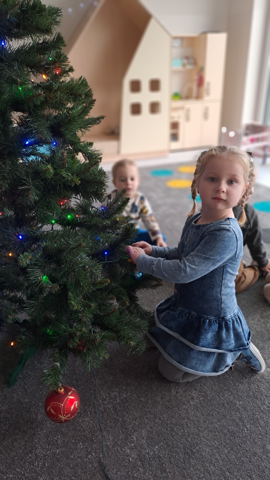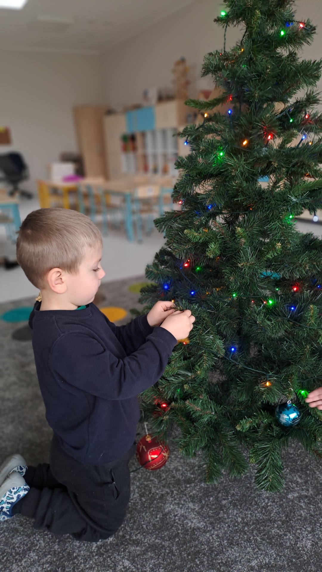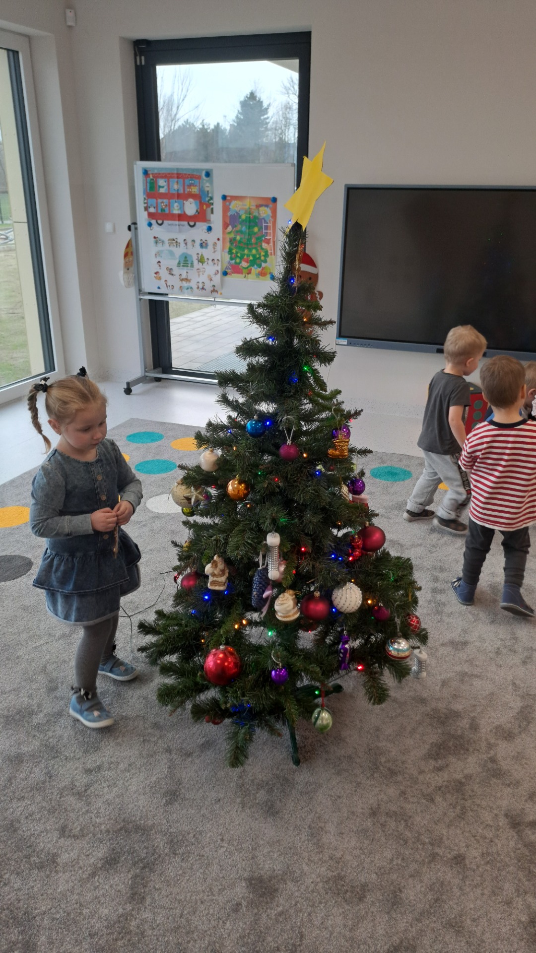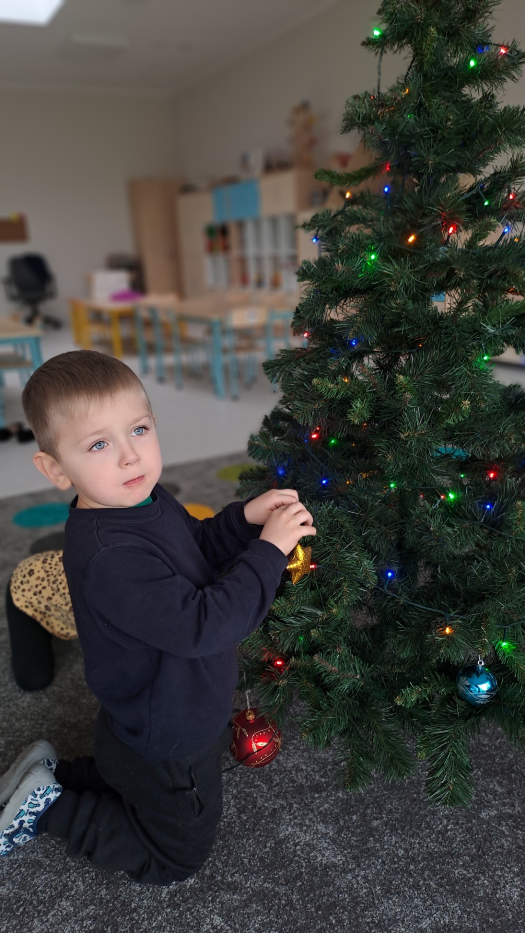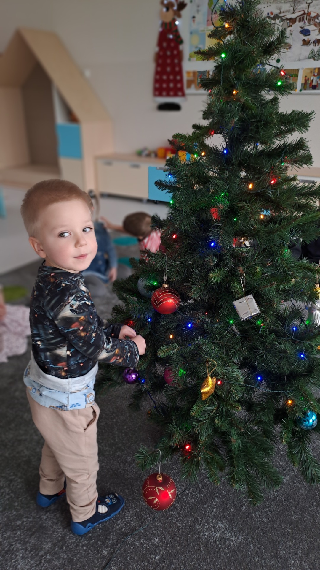Dzieci z radością ubierały choinkę, zawieszając kolorowe bombki i łańcuchy. Podczas wspólnego dekorowania panowała ciepła i radosna atmosfera, której towarzyszyła świąteczna piosenka.