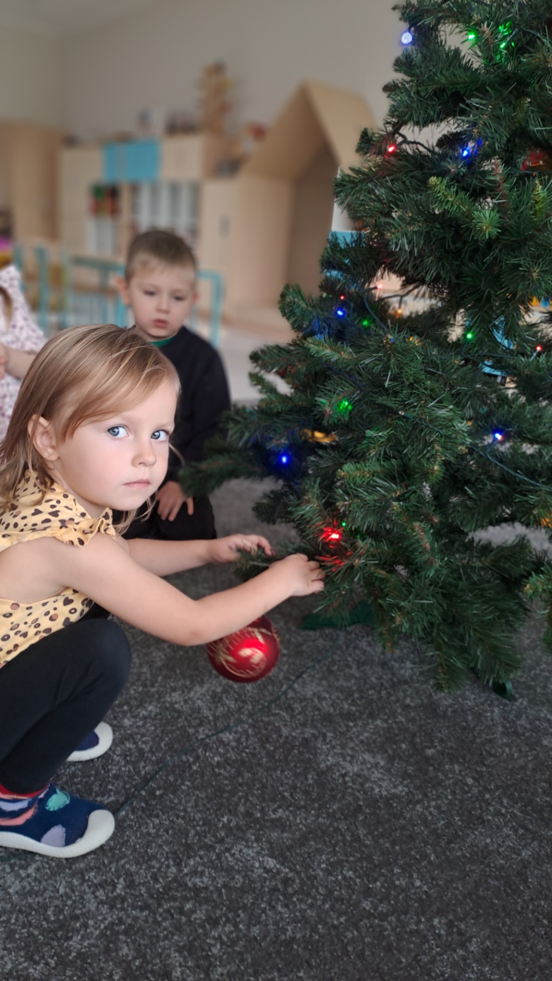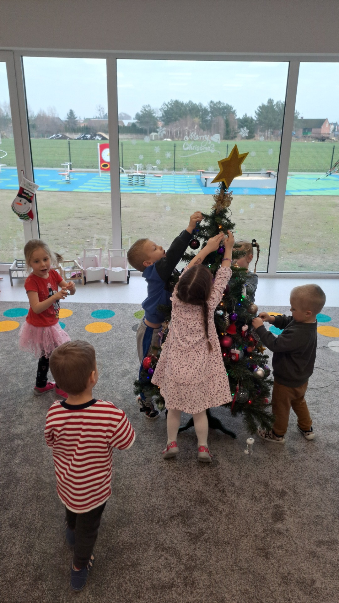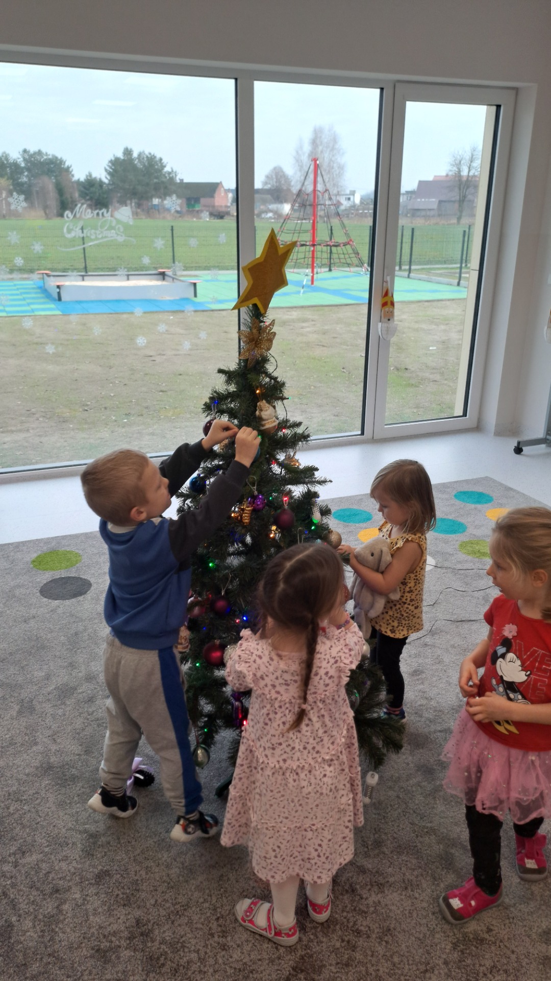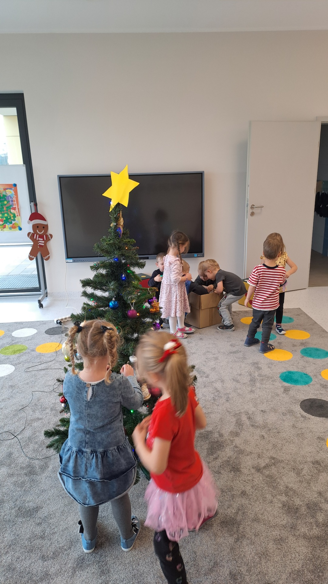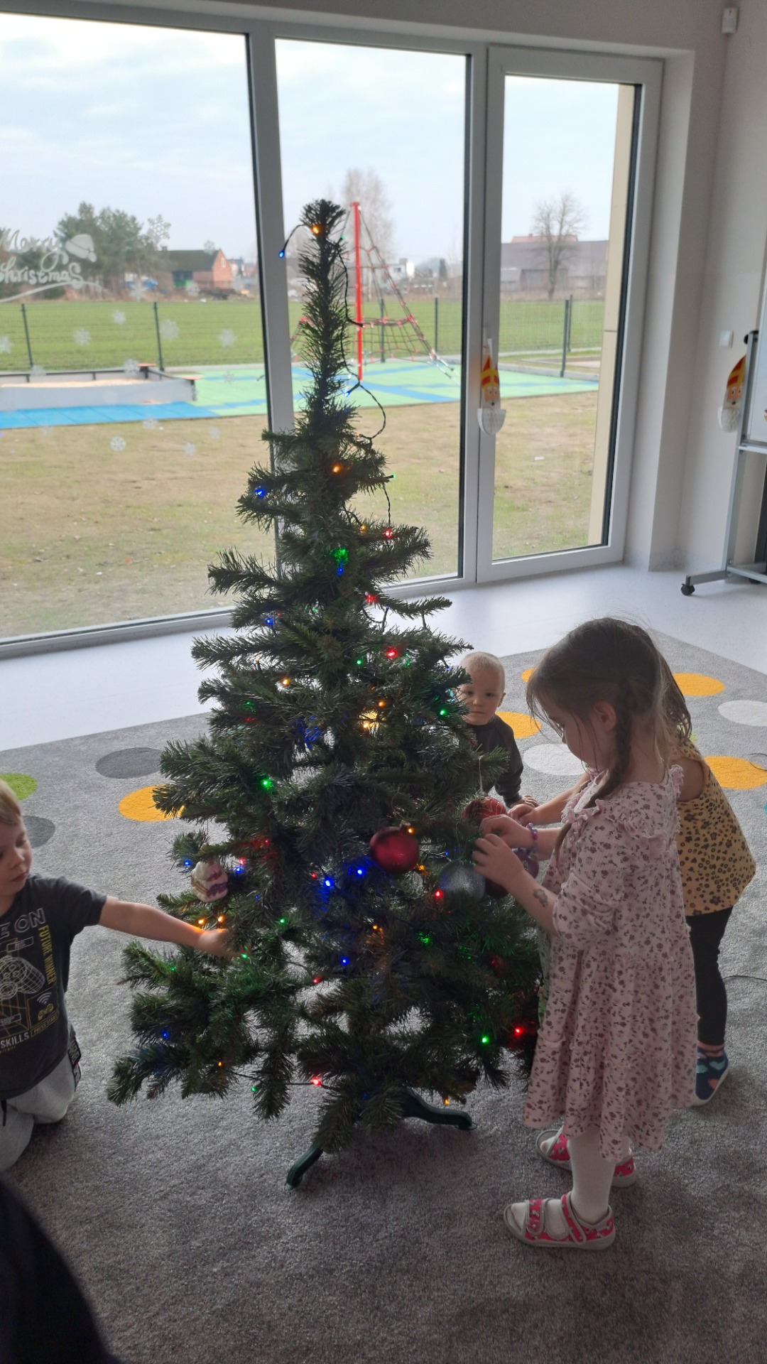 Dzieci z radością ubierały choinkę, zawieszając kolorowe bombki i łańcuchy. Podczas wspólnego dekorowania panowała ciepła i radosna atmosfera, której towarzyszyła świąteczna piosenka.