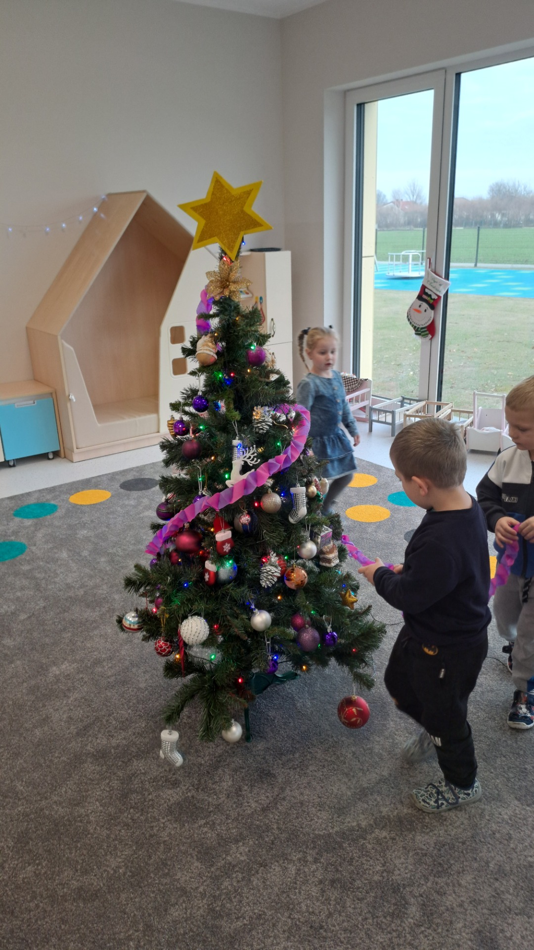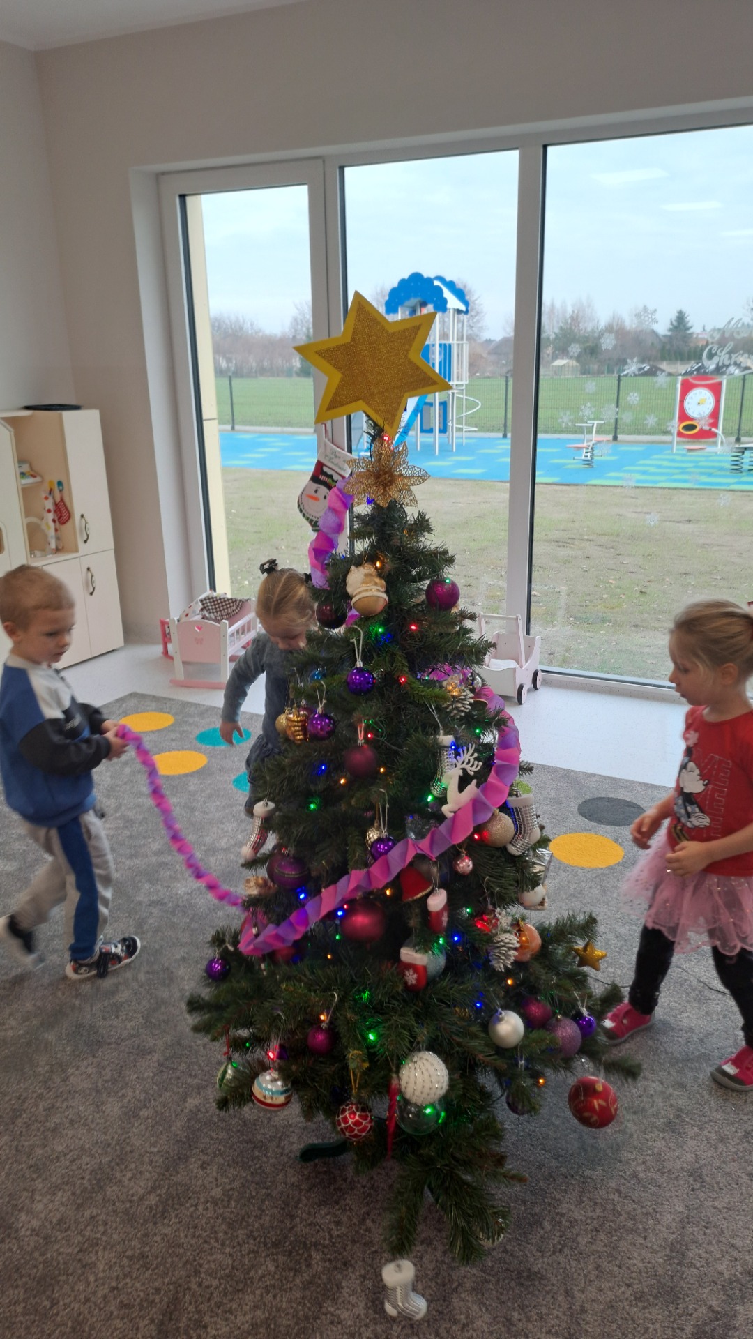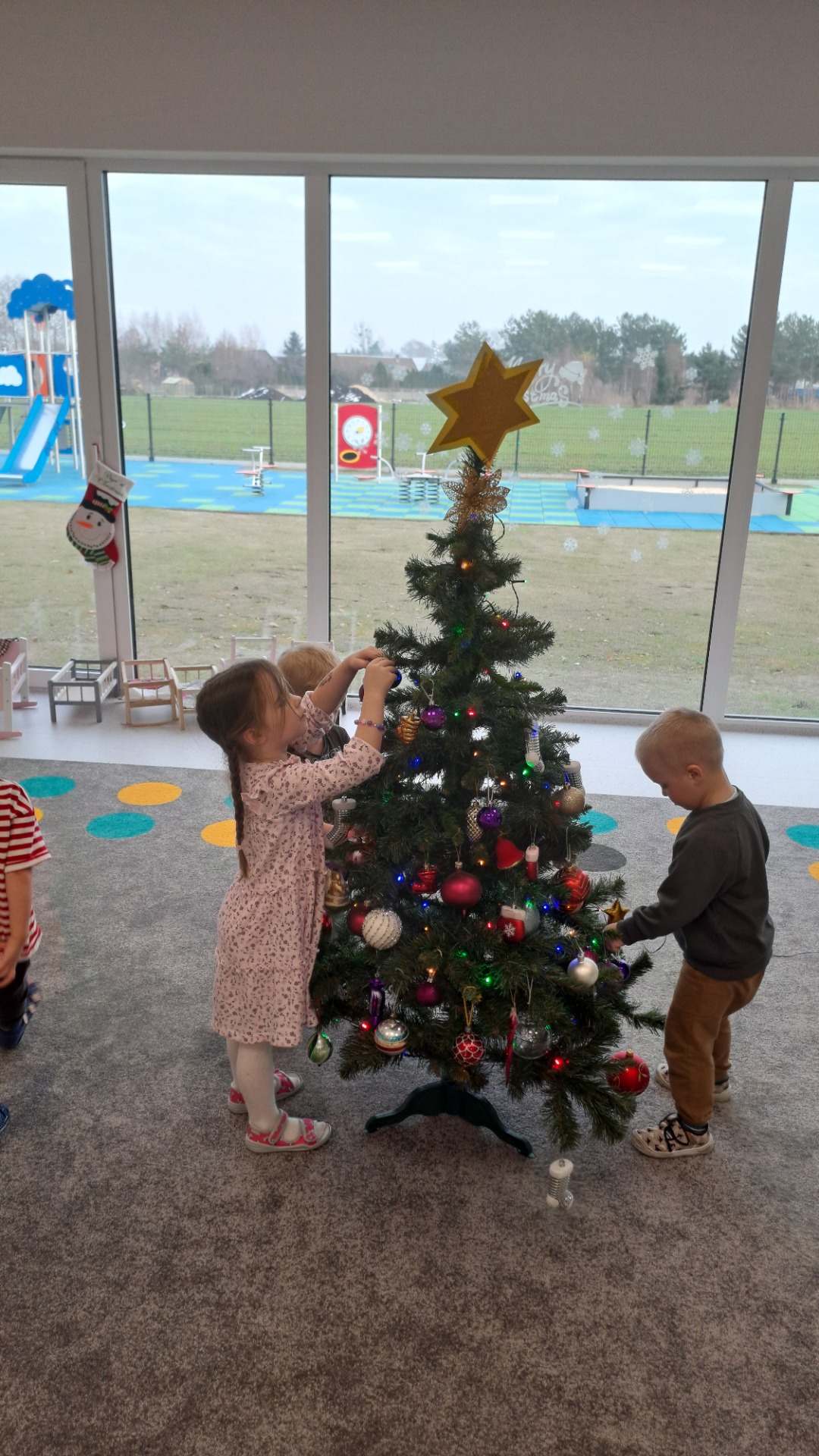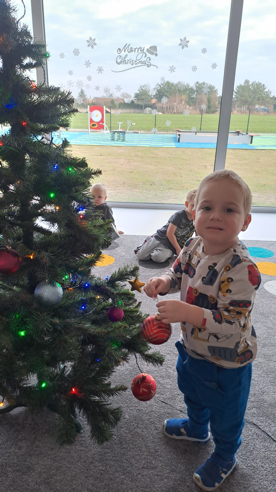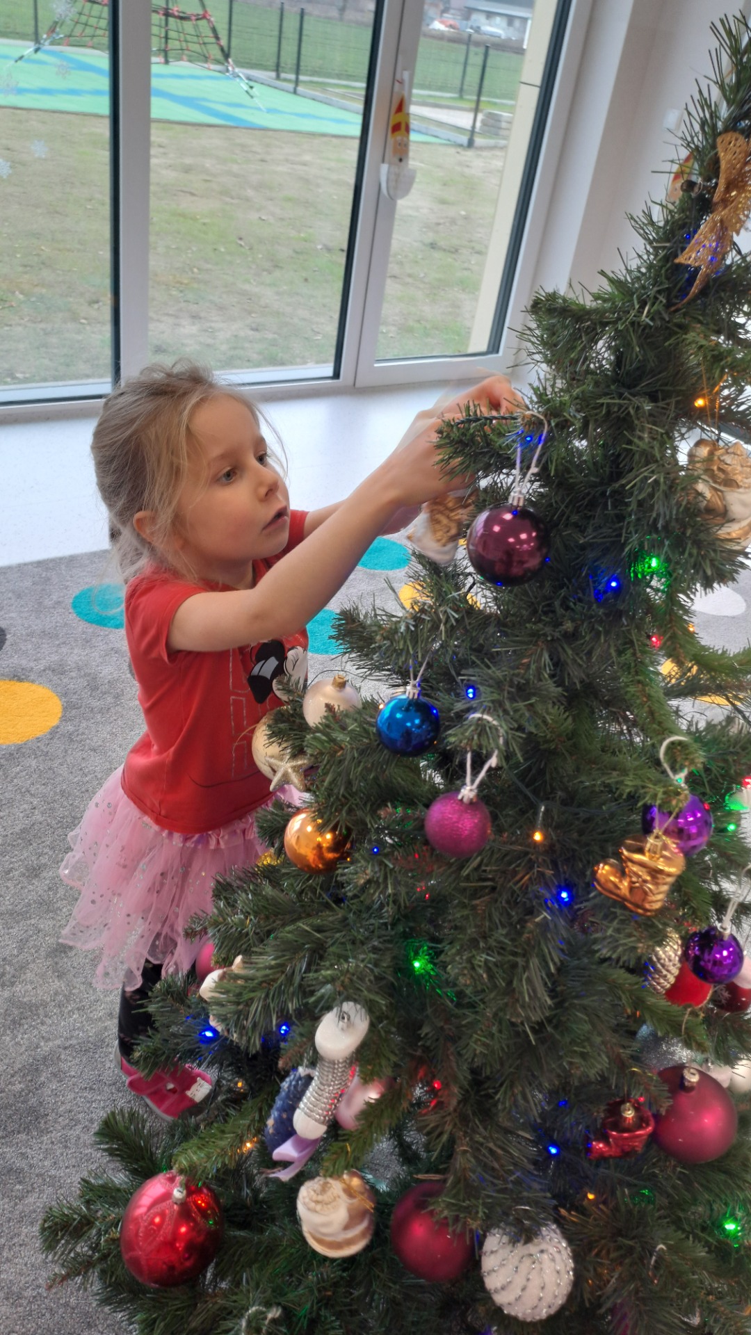 Dzieci z radością ubierały choinkę, zawieszając kolorowe bombki i łańcuchy. Podczas wspólnego dekorowania panowała ciepła i radosna atmosfera, której towarzyszyła świąteczna piosenka.