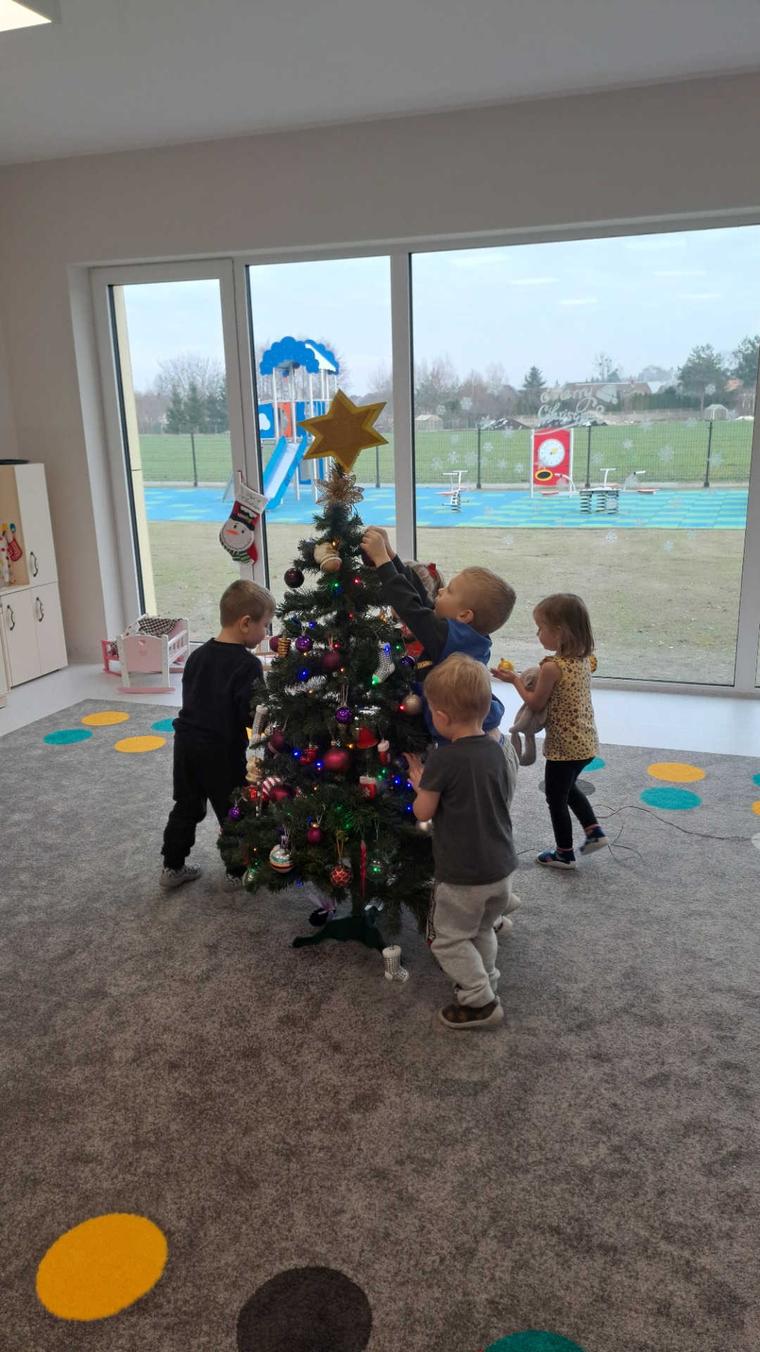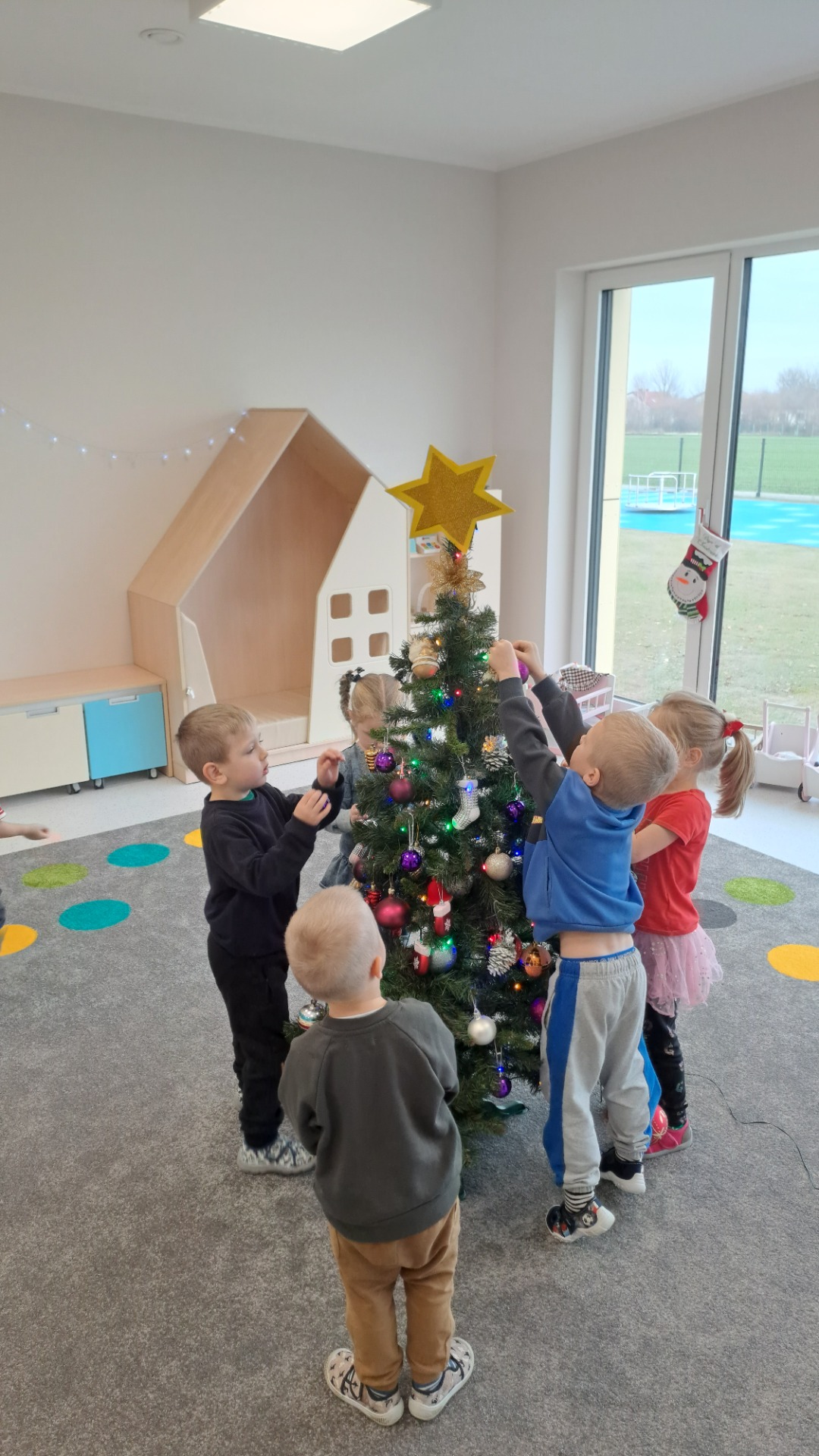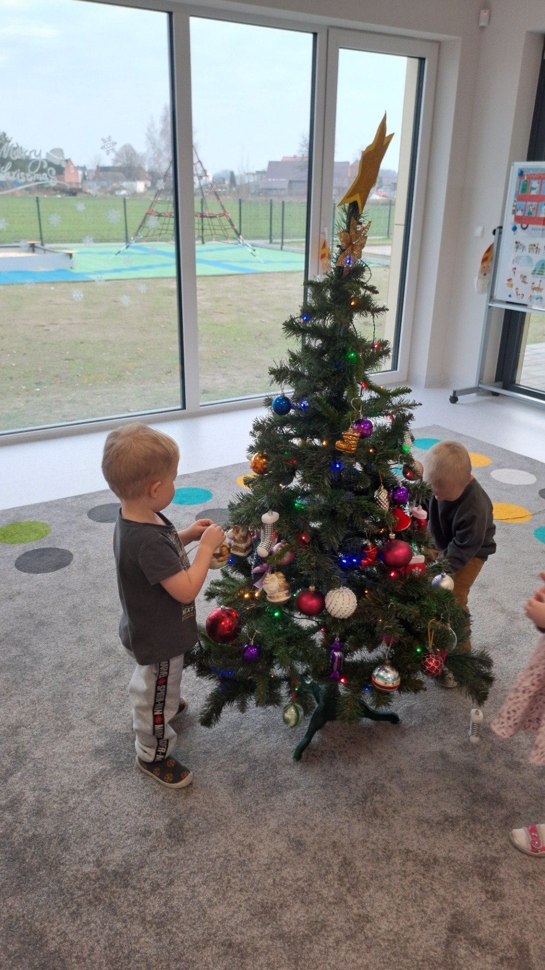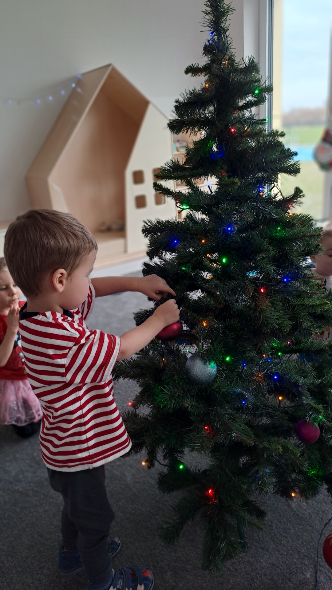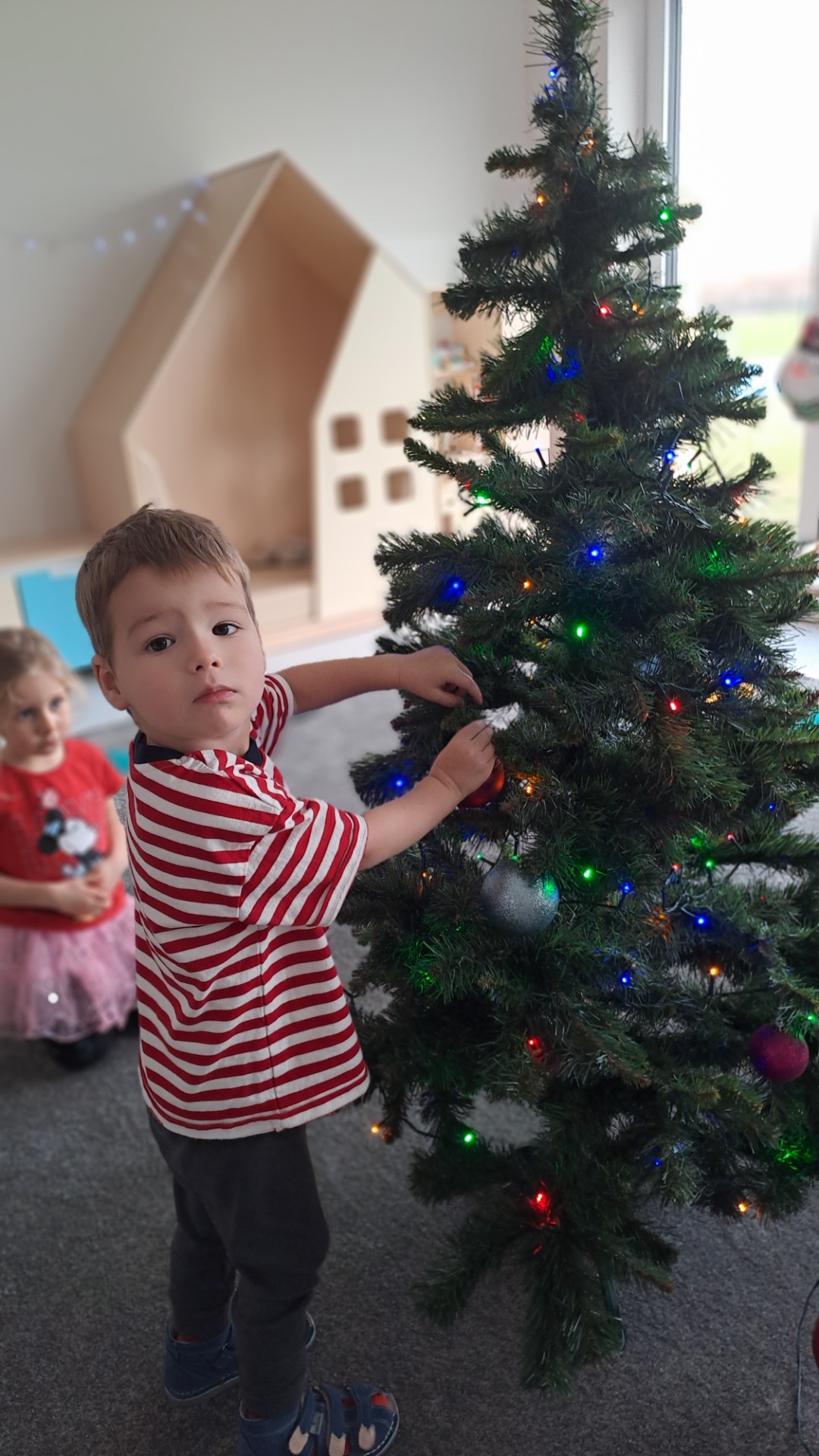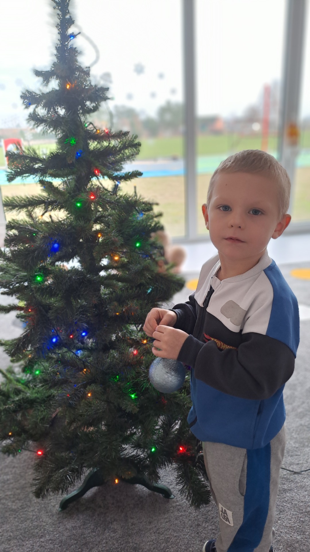 Dzieci z radością ubierały choinkę, zawieszając kolorowe bombki i łańcuchy. Podczas wspólnego dekorowania panowała ciepła i radosna atmosfera, której towarzyszyła świąteczna piosenka.