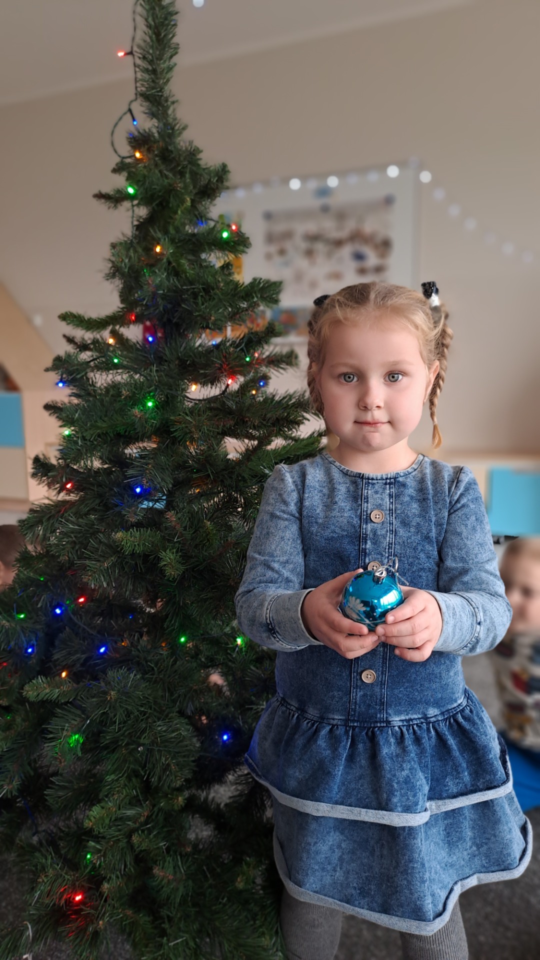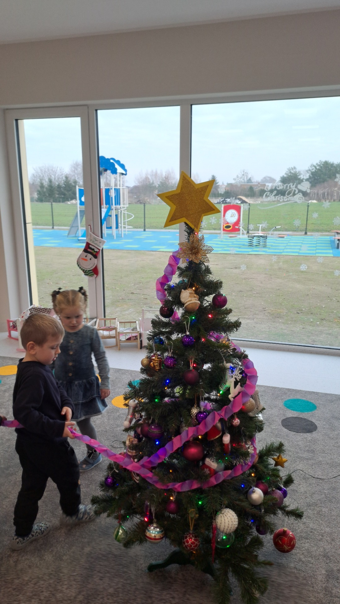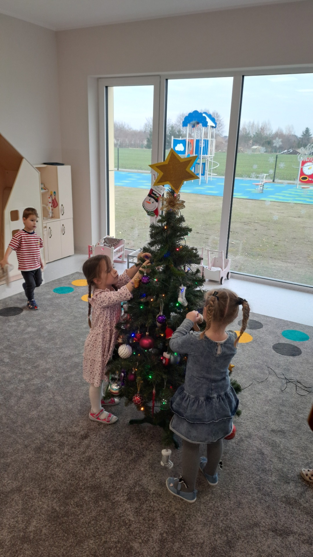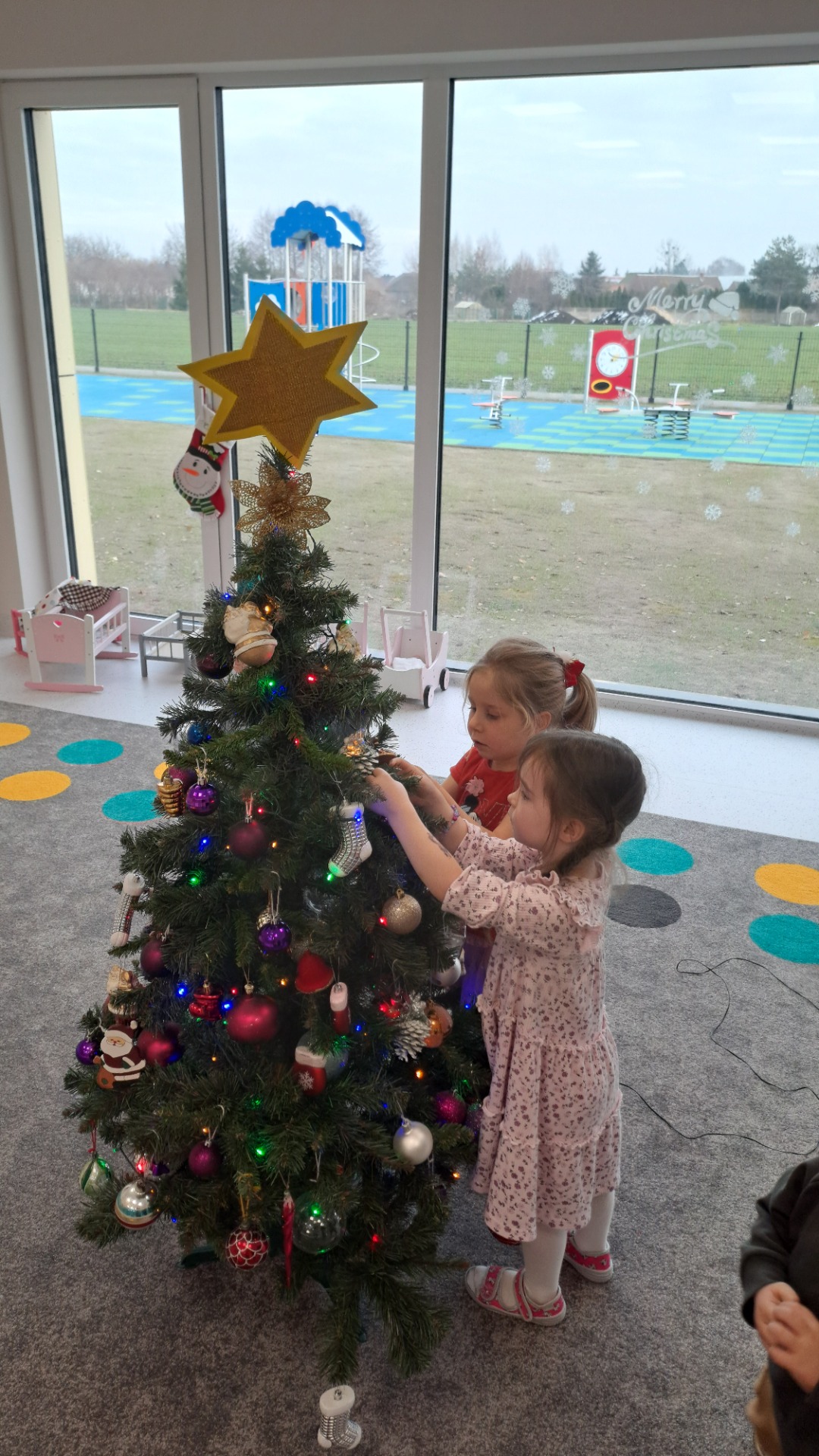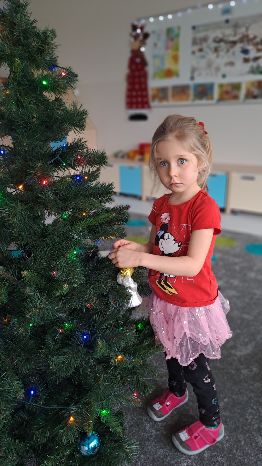 Dzieci z radością ubierały choinkę, zawieszając kolorowe bombki i łańcuchy. Podczas wspólnego dekorowania panowała ciepła i radosna atmosfera, której towarzyszyła świąteczna piosenka.