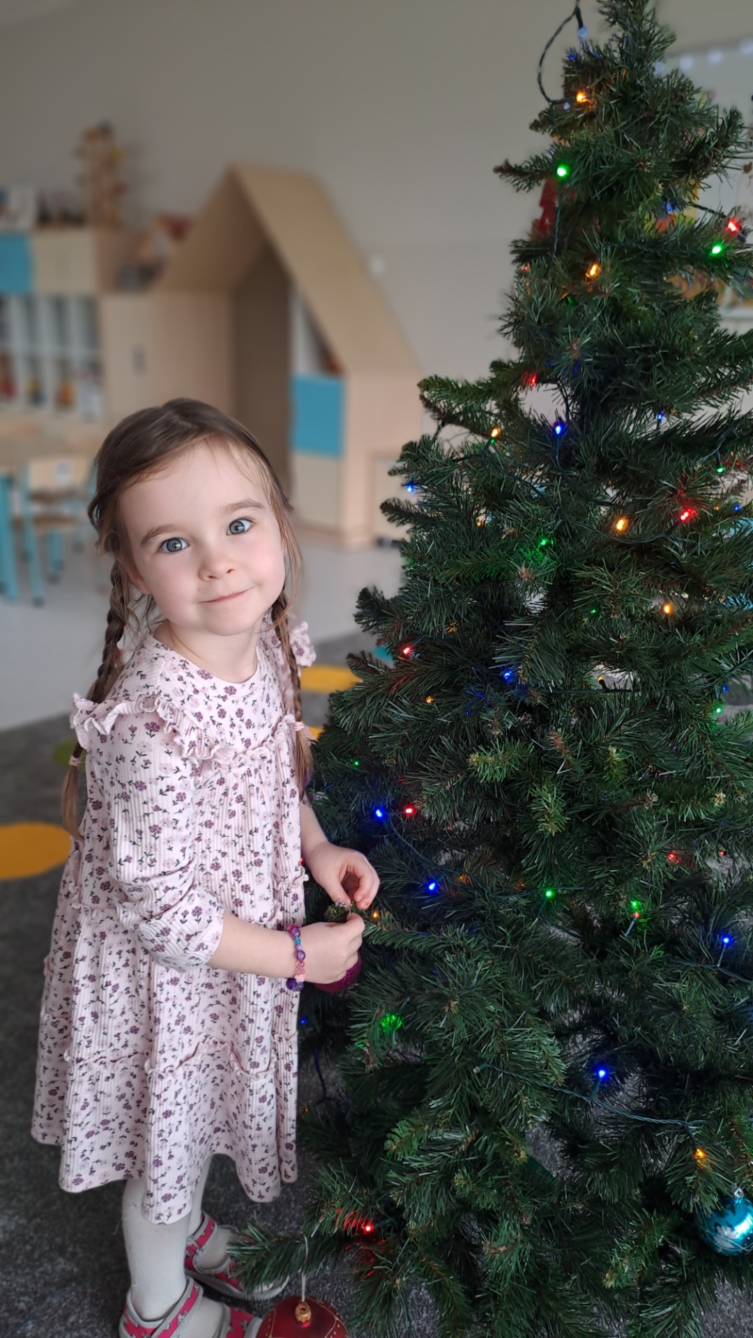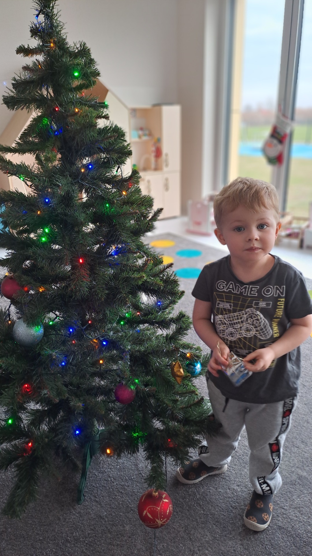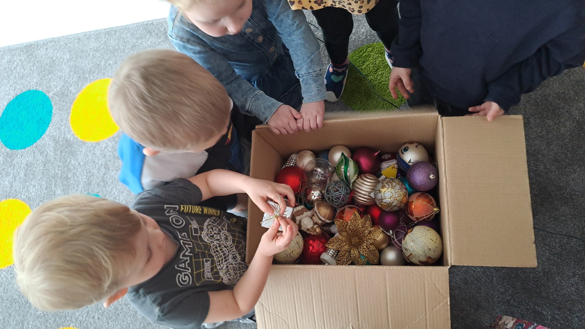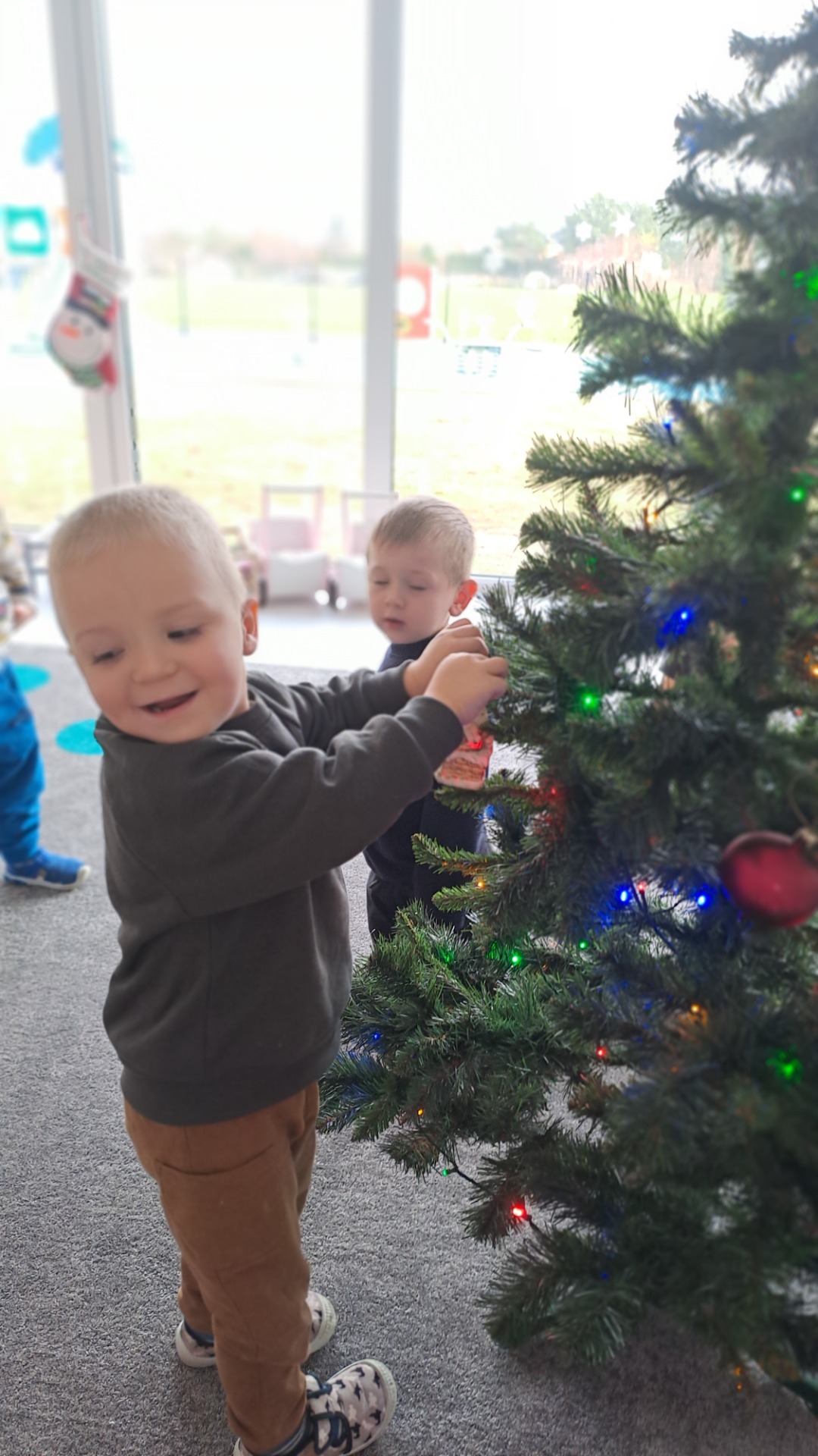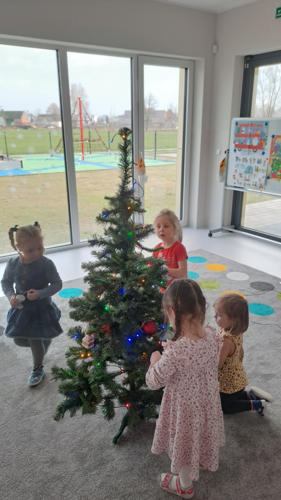 Dzieci z radością ubierały choinkę, zawieszając kolorowe bombki i łańcuchy. Podczas wspólnego dekorowania panowała ciepła i radosna atmosfera, której towarzyszyła świąteczna piosenka.