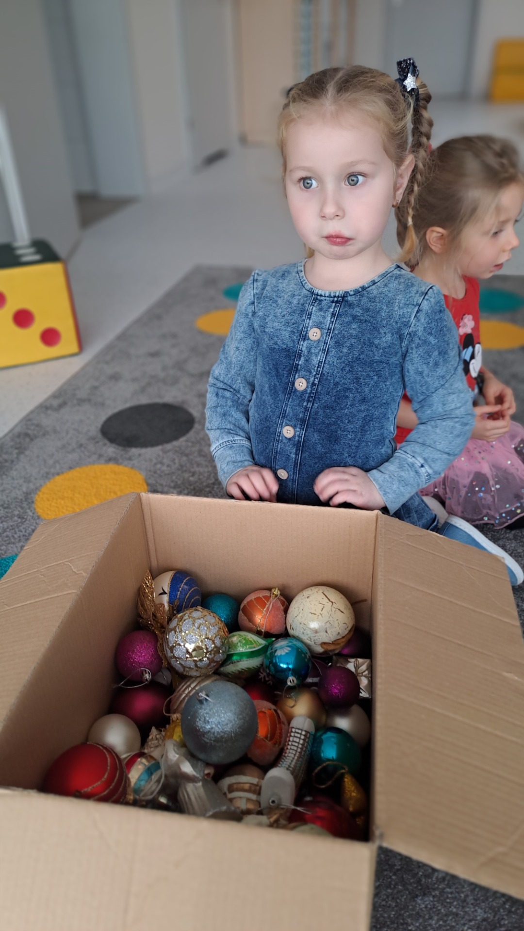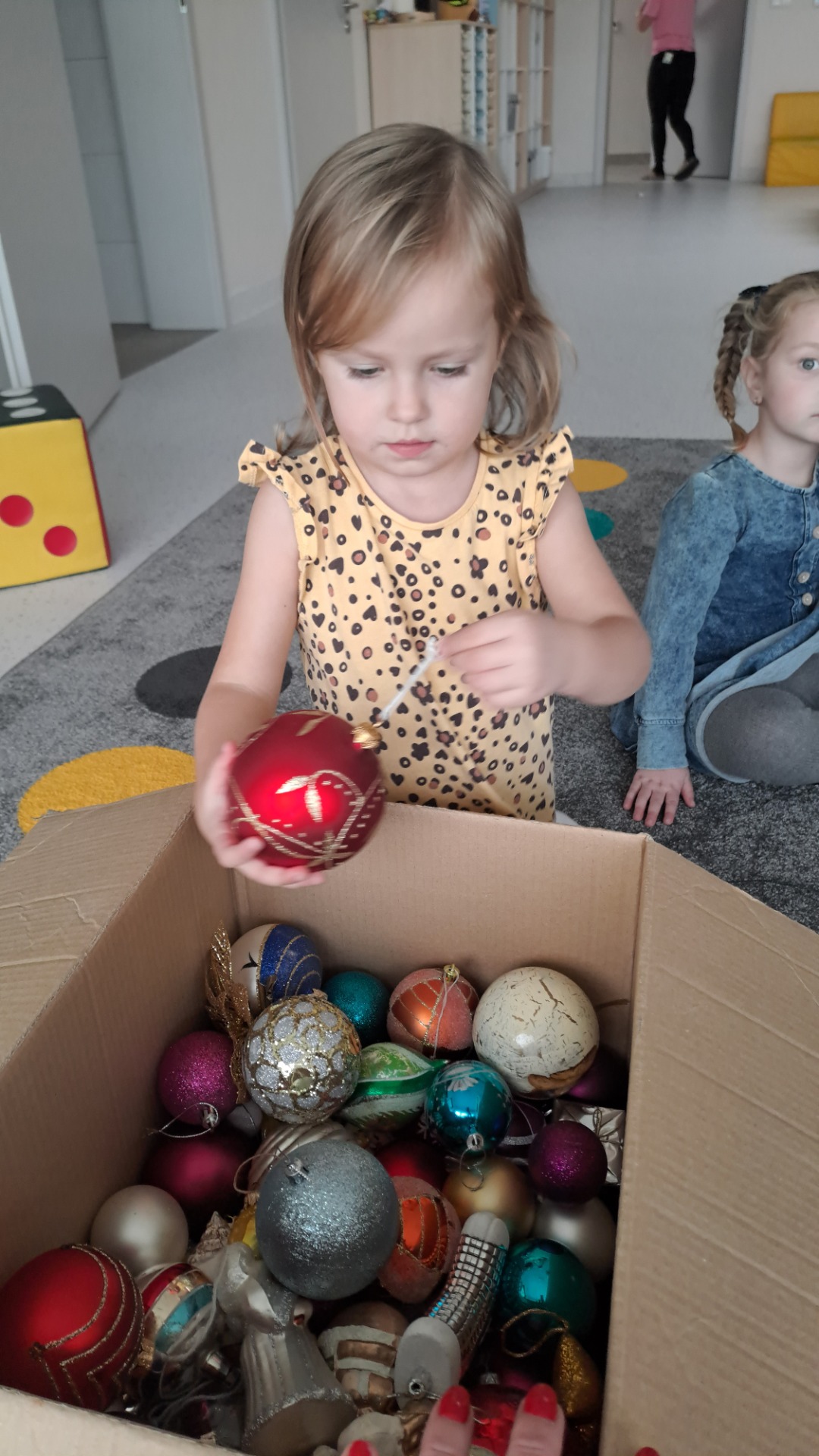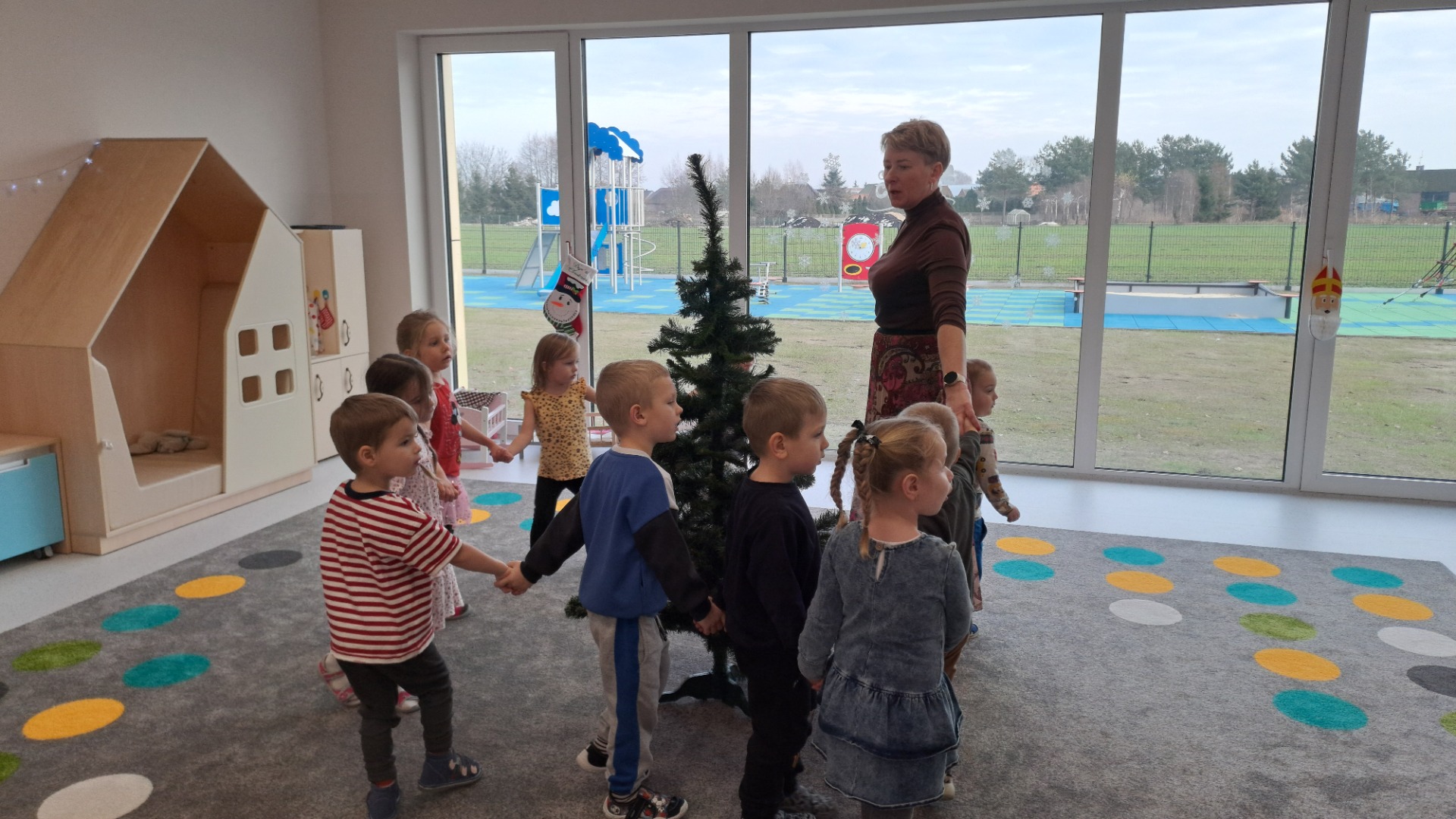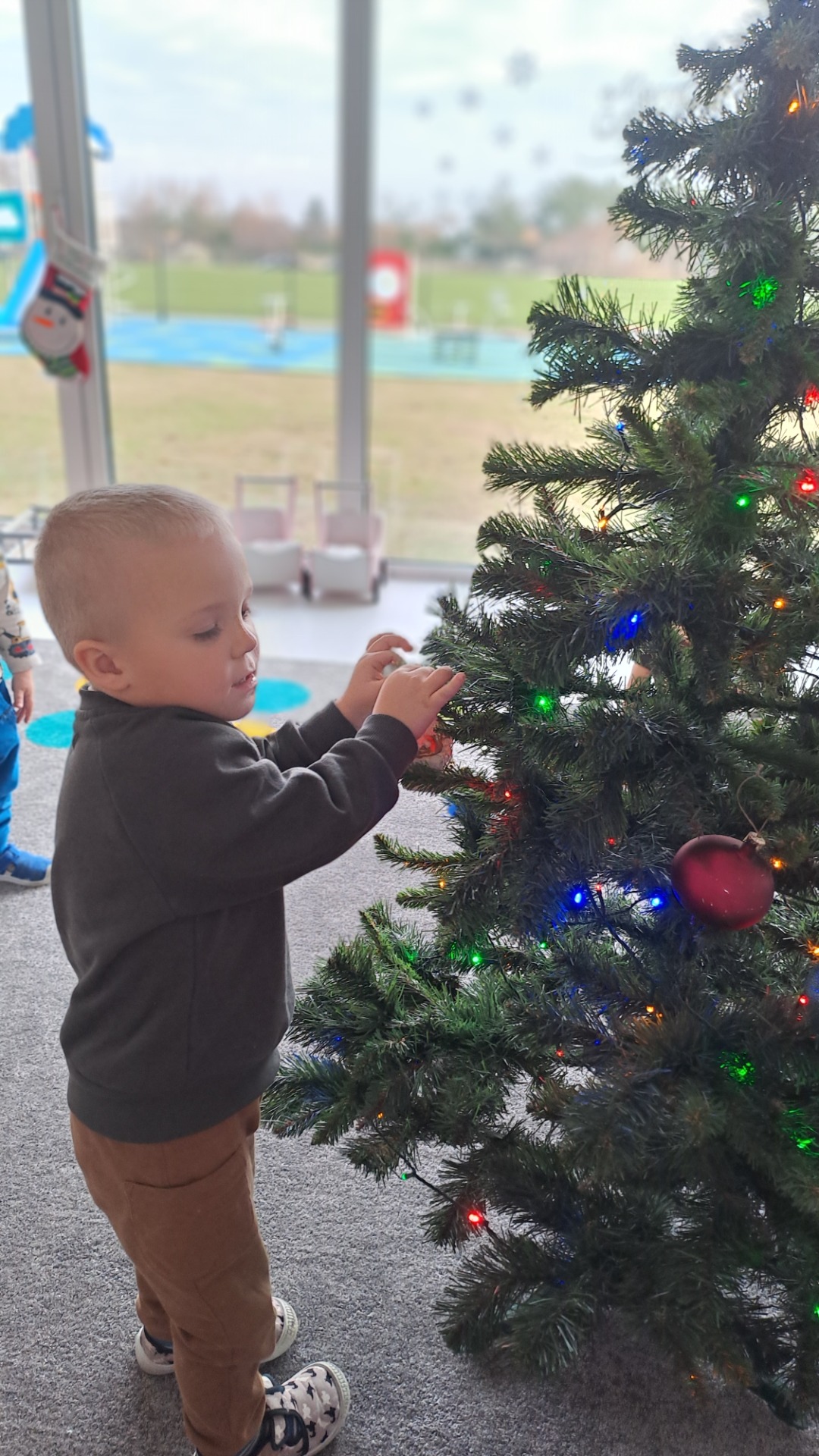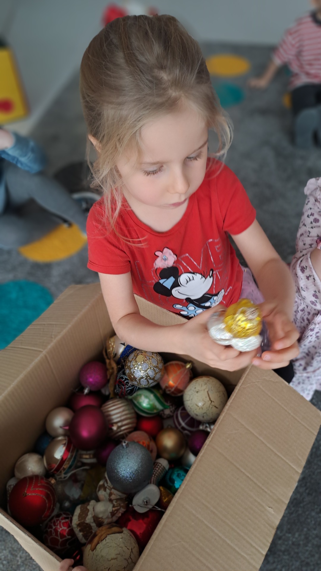 Dzieci z radością ubierały choinkę, zawieszając kolorowe bombki i łańcuchy. Podczas wspólnego dekorowania panowała ciepła i radosna atmosfera, której towarzyszyła świąteczna piosenka.