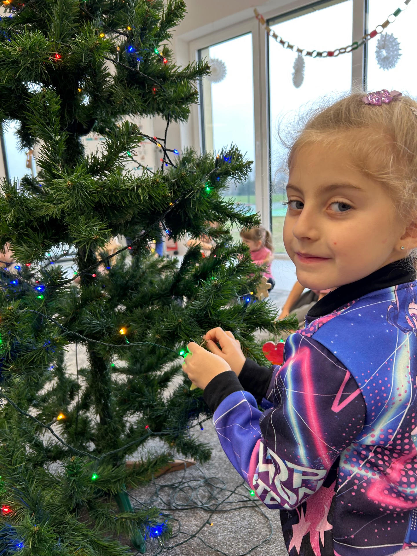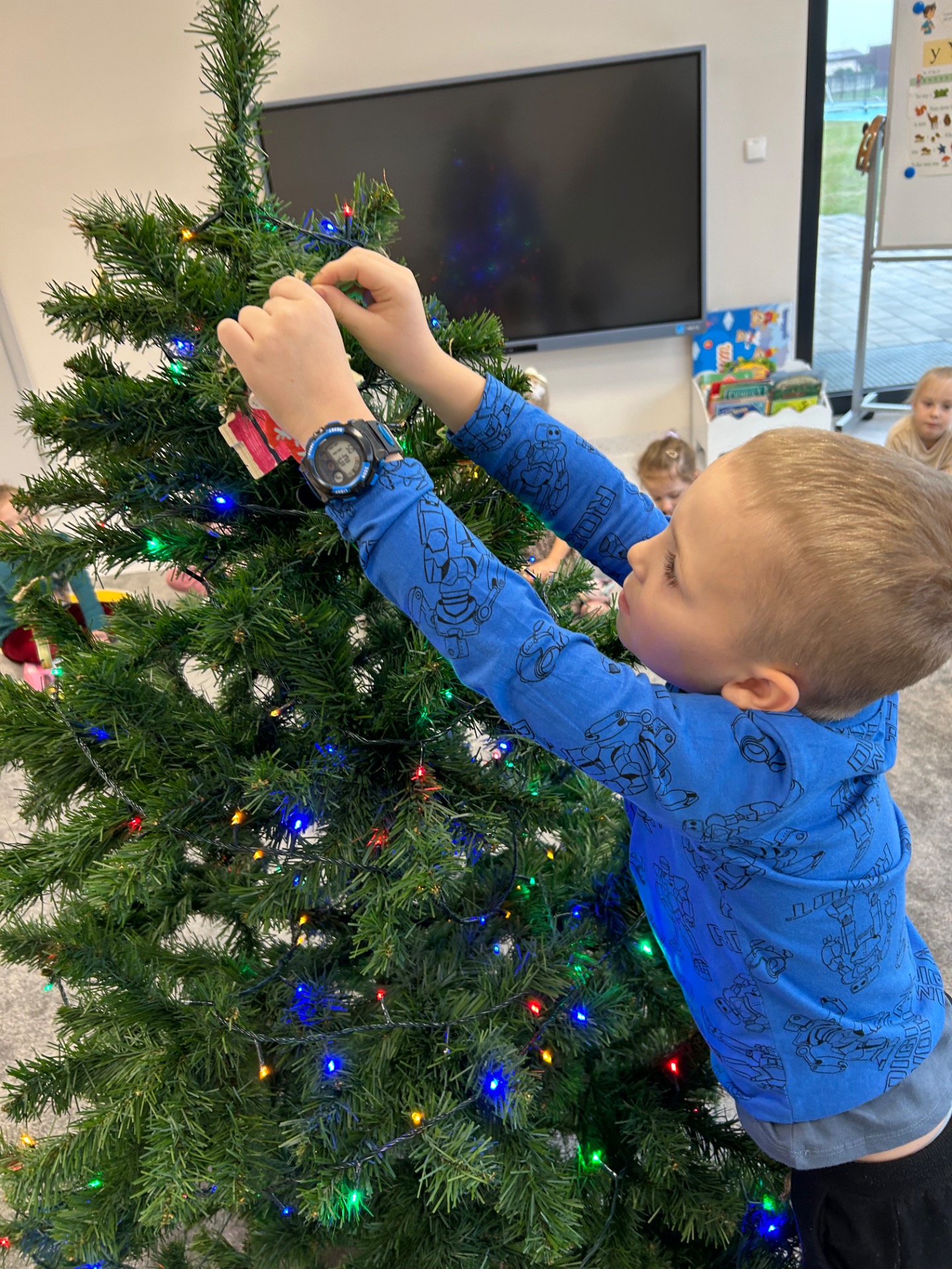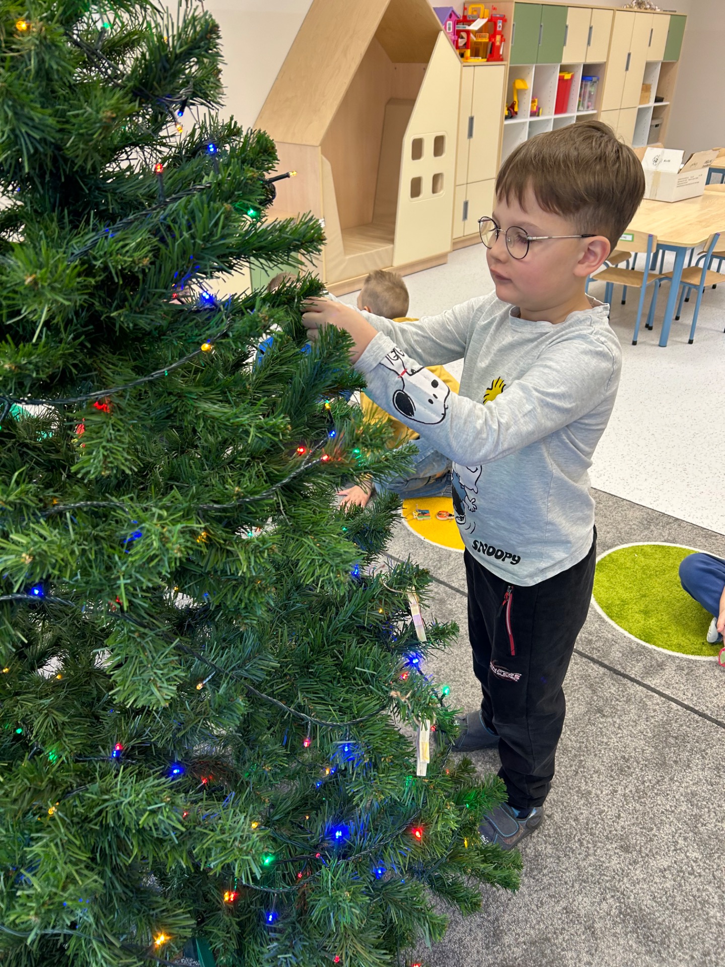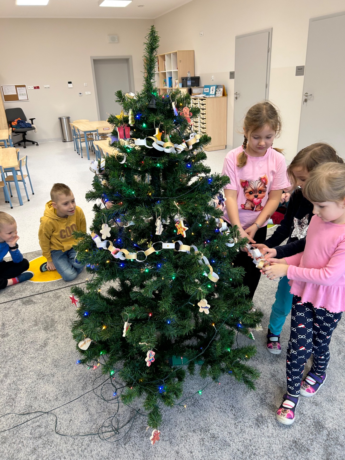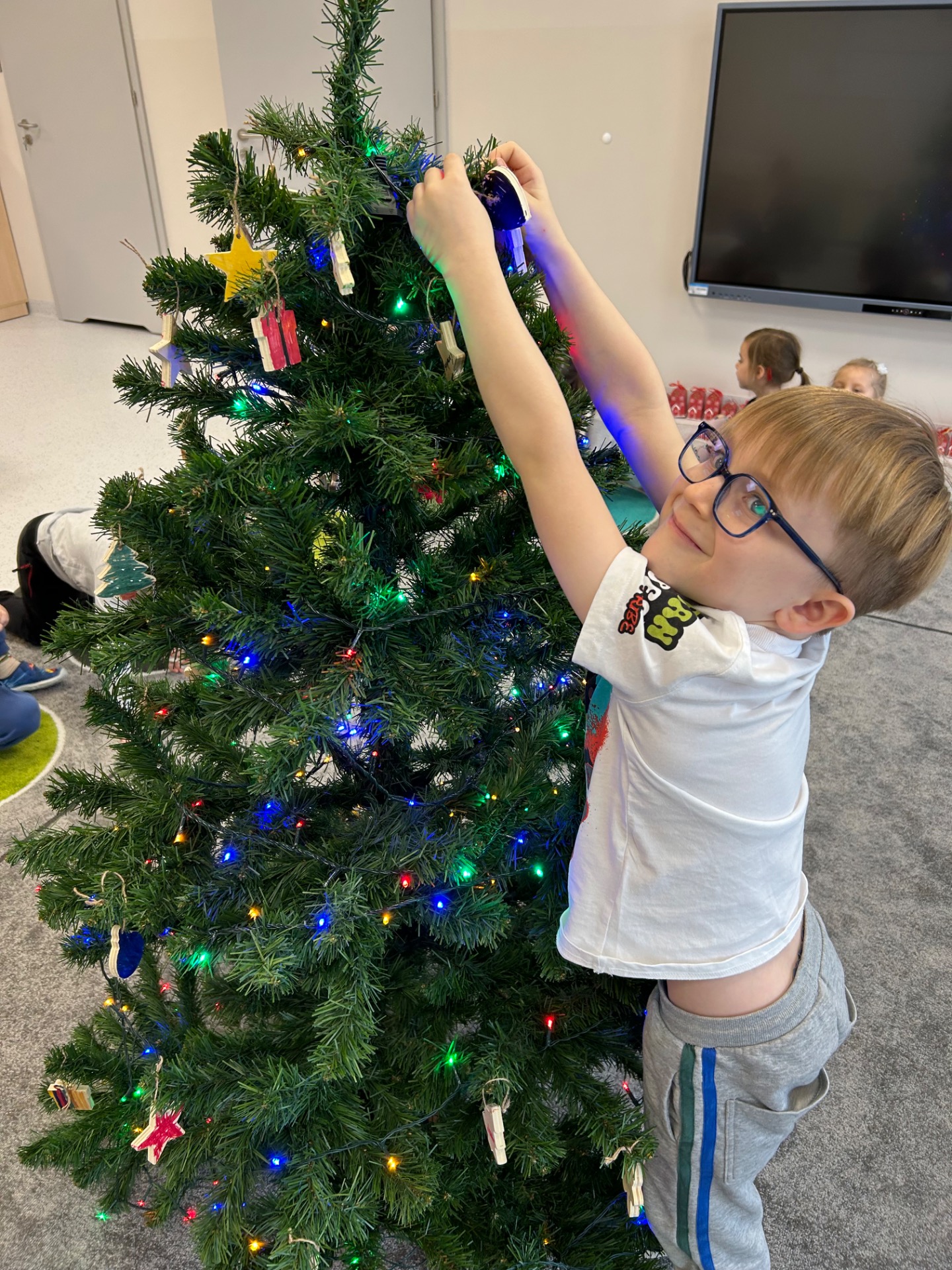 Z okazji zbliżających się Świąt Bożego Narodzenia nasza grupa starszaków z wielką radością przystąpiła do ubierania choinki. Dzieci samodzielnie zawieszały własnoręcznie wykonane ozdoby, tworząc wyjątkową, świąteczną atmosferę.