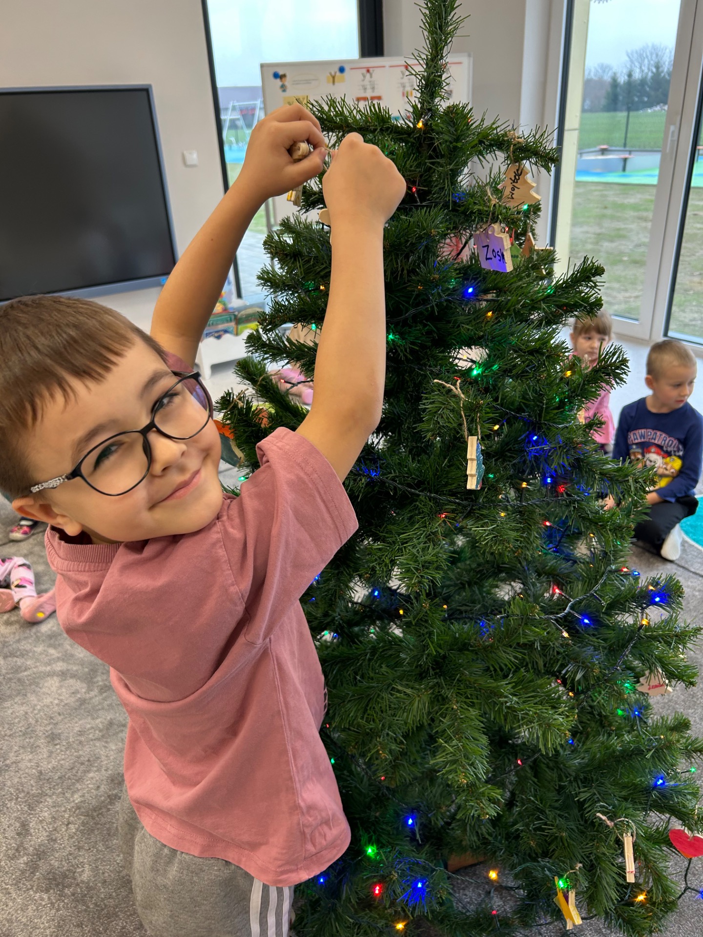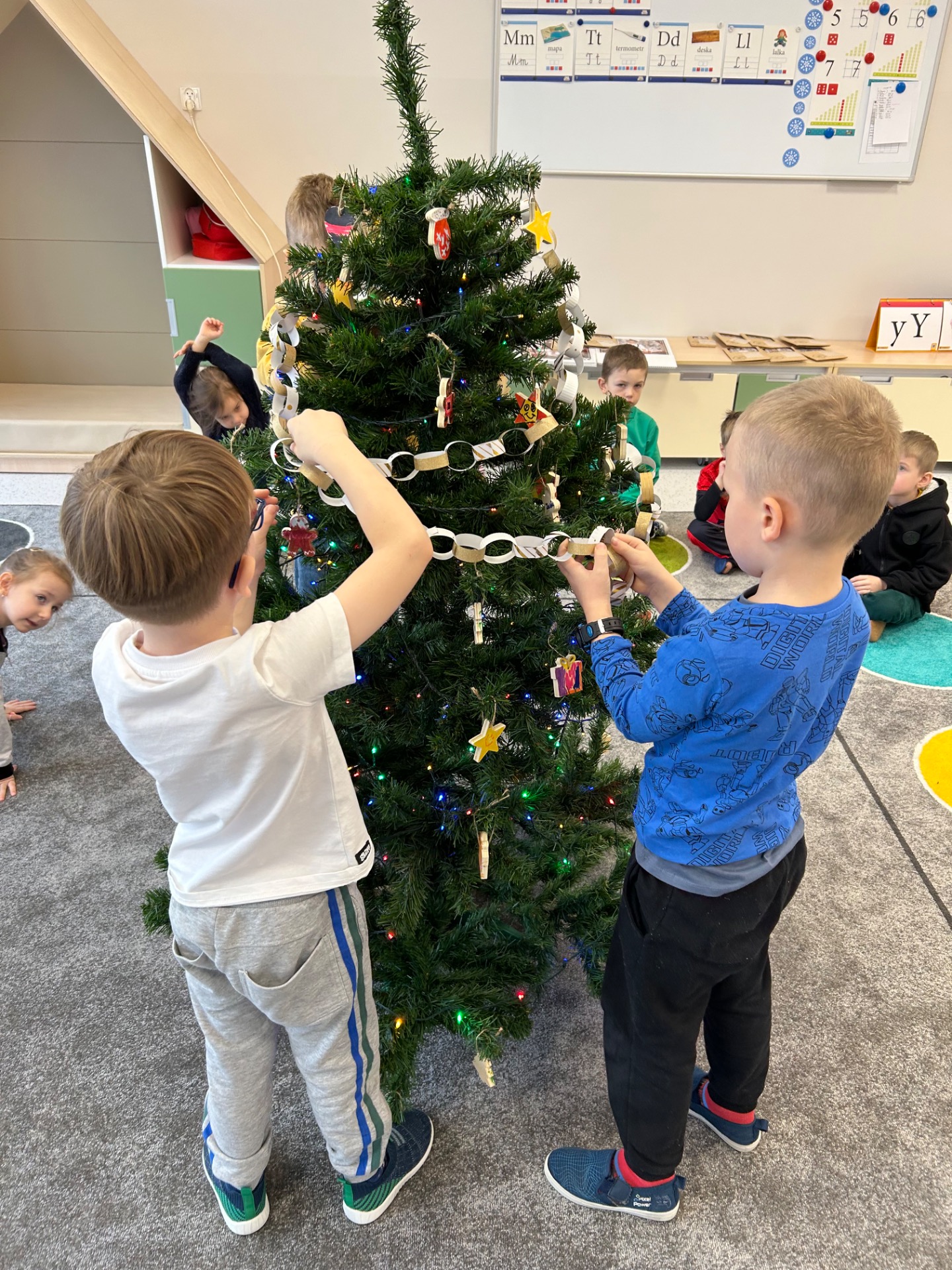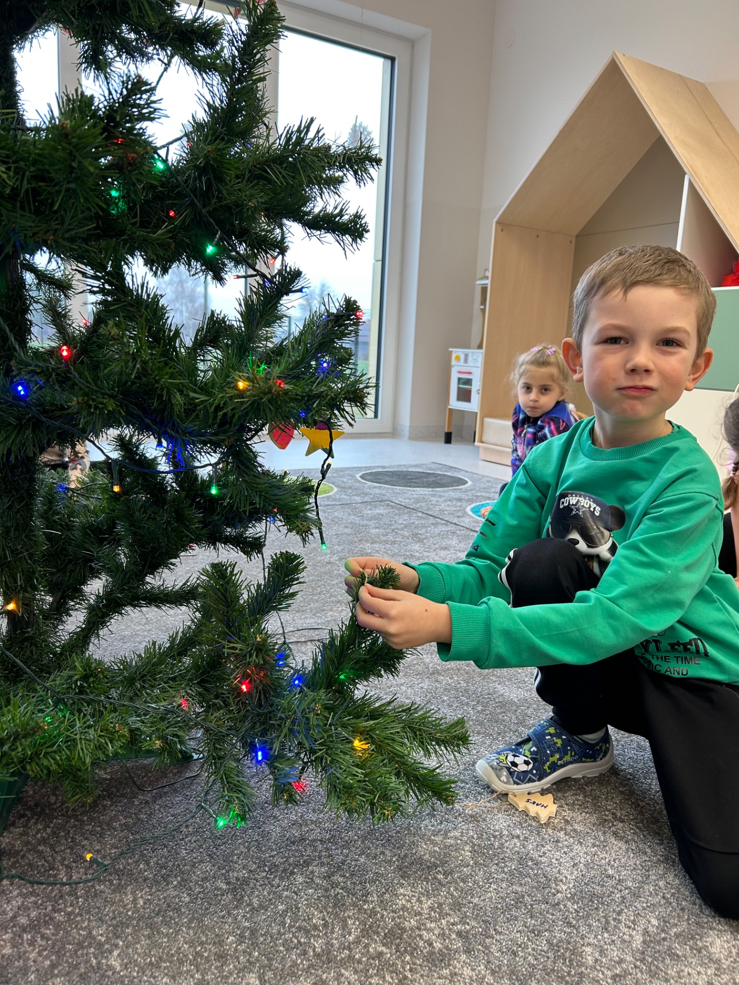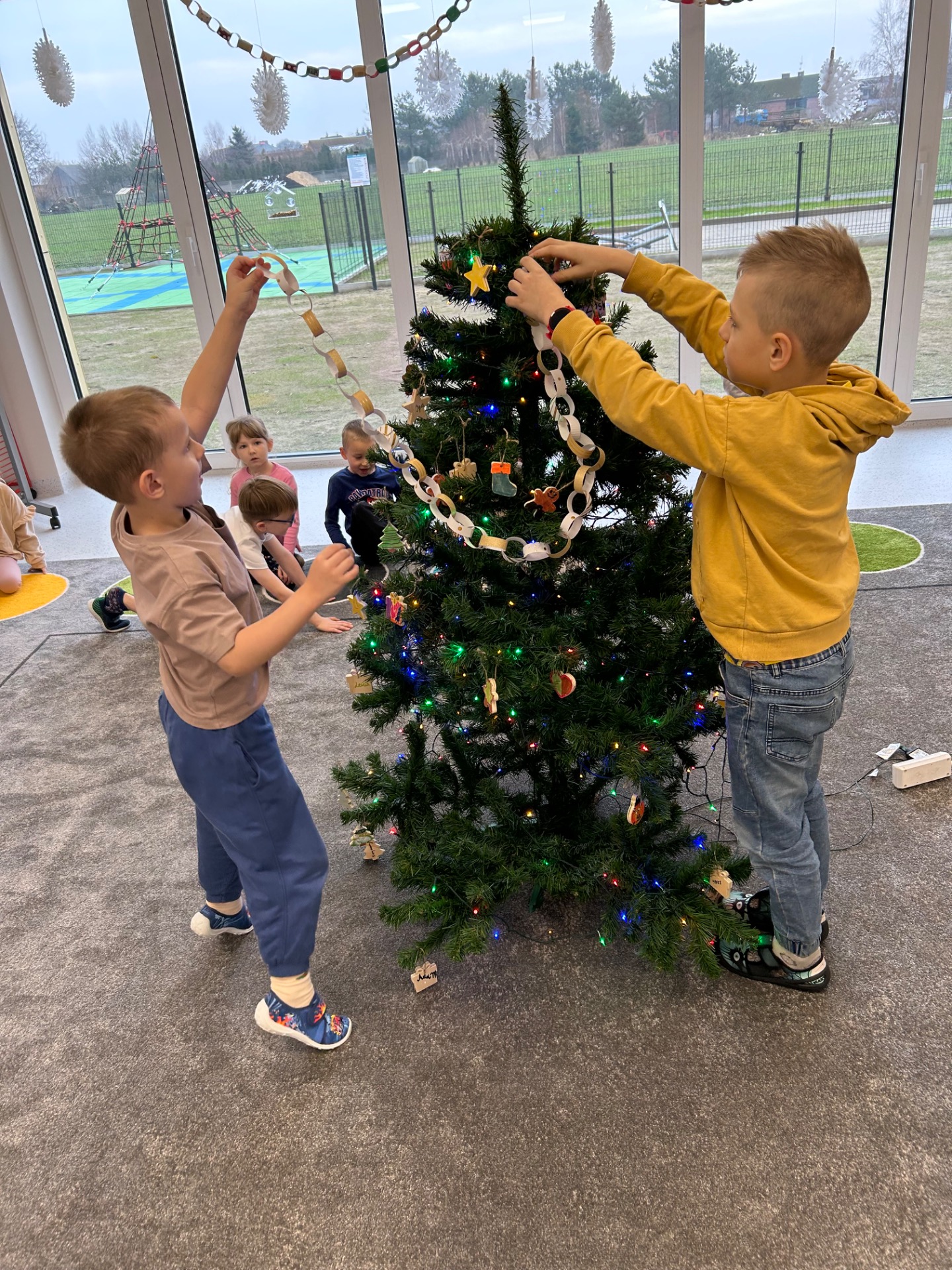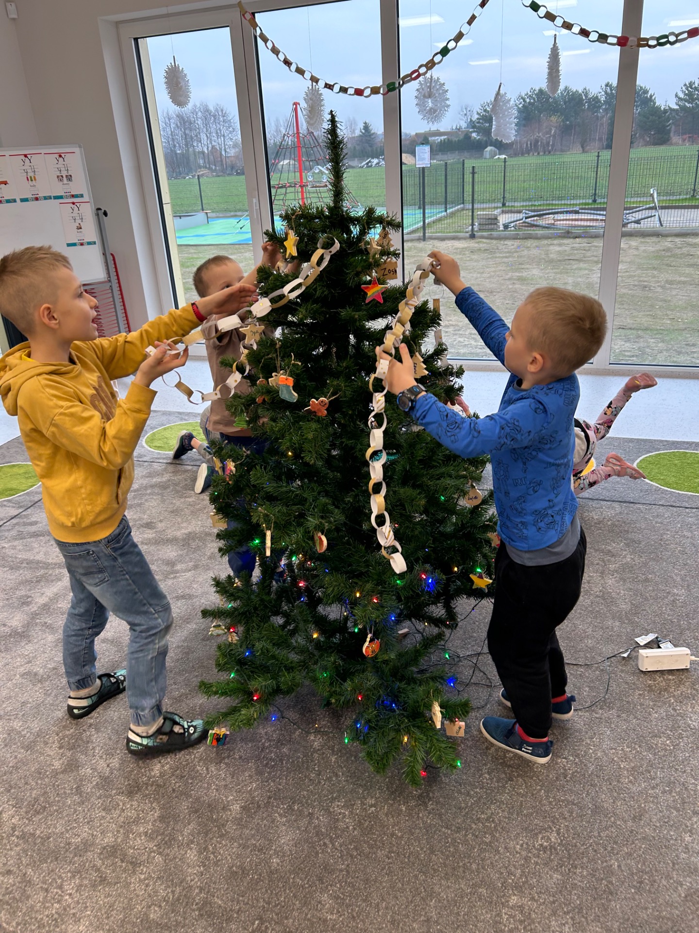 Z okazji zbliżających się Świąt Bożego Narodzenia nasza grupa starszaków z wielką radością przystąpiła do ubierania choinki. Dzieci samodzielnie zawieszały własnoręcznie wykonane ozdoby, tworząc wyjątkową, świąteczną atmosferę.