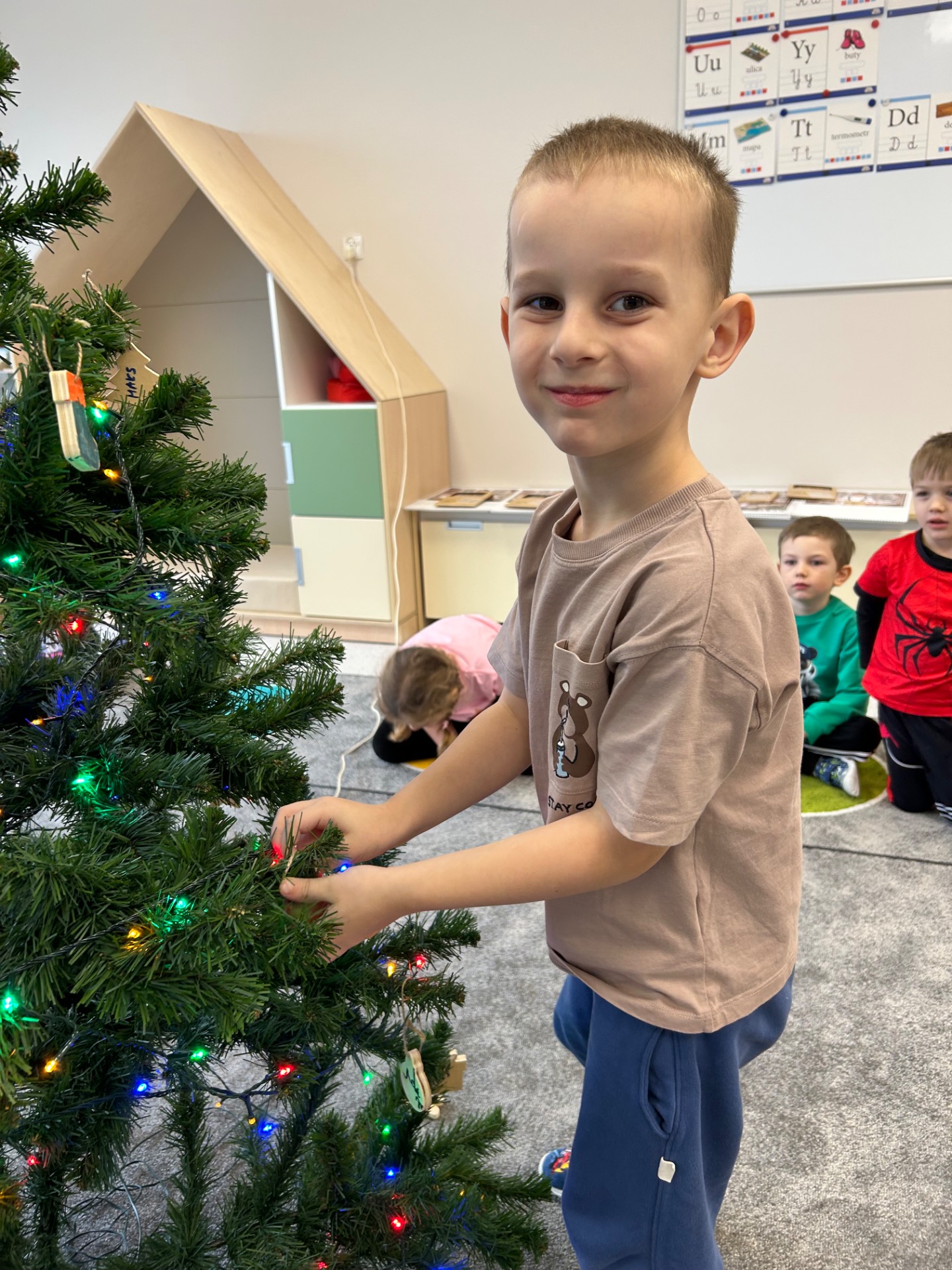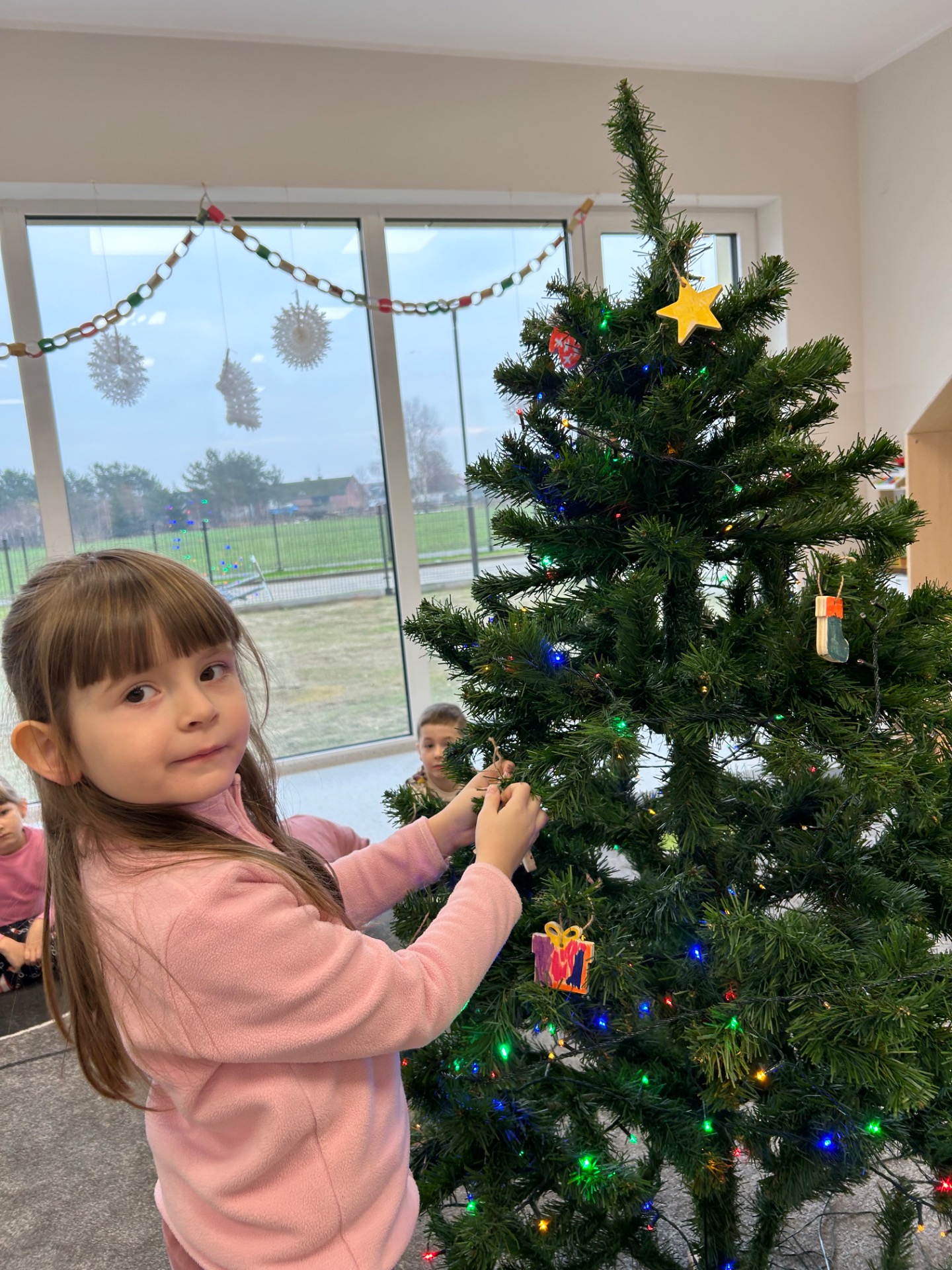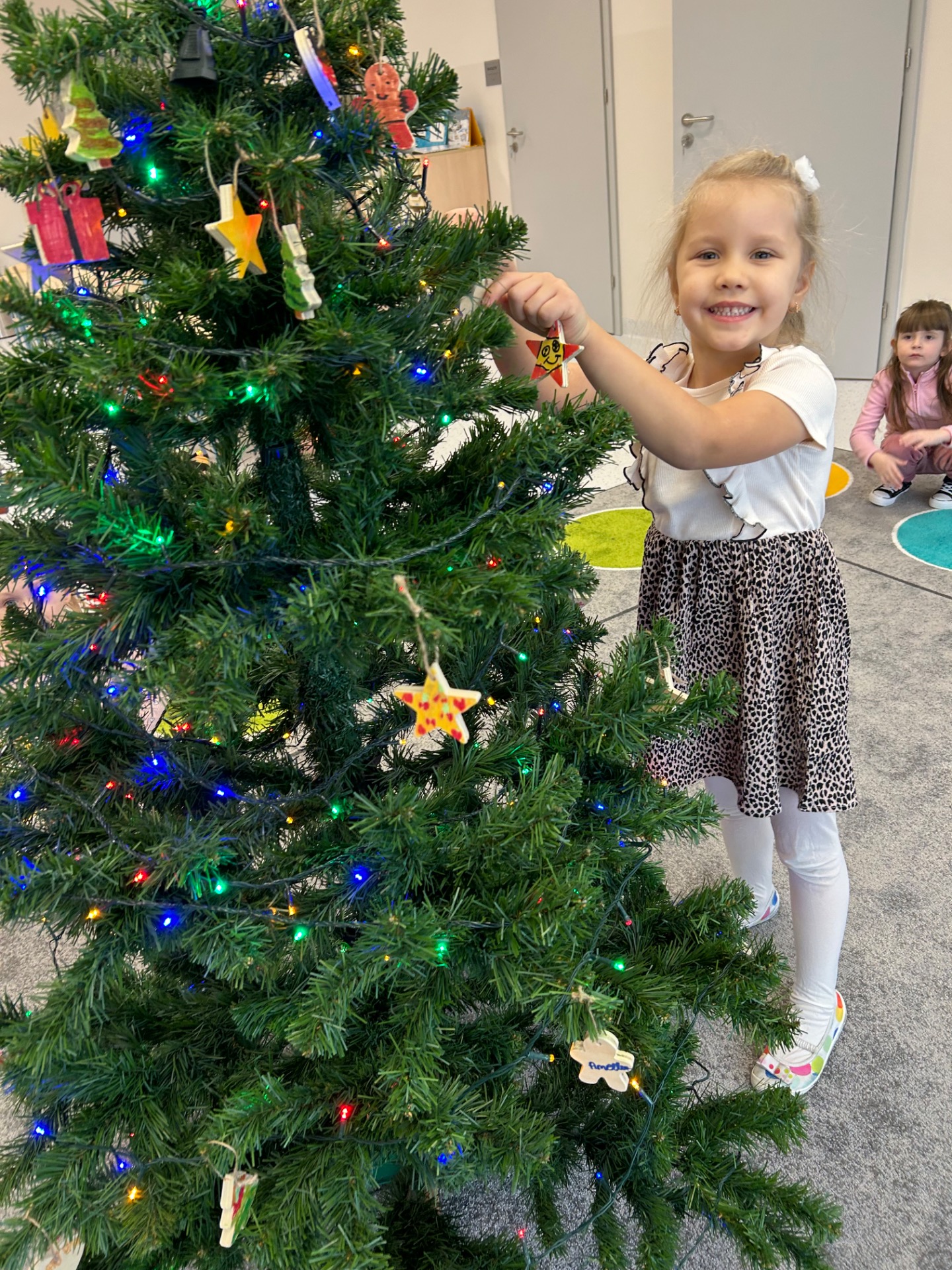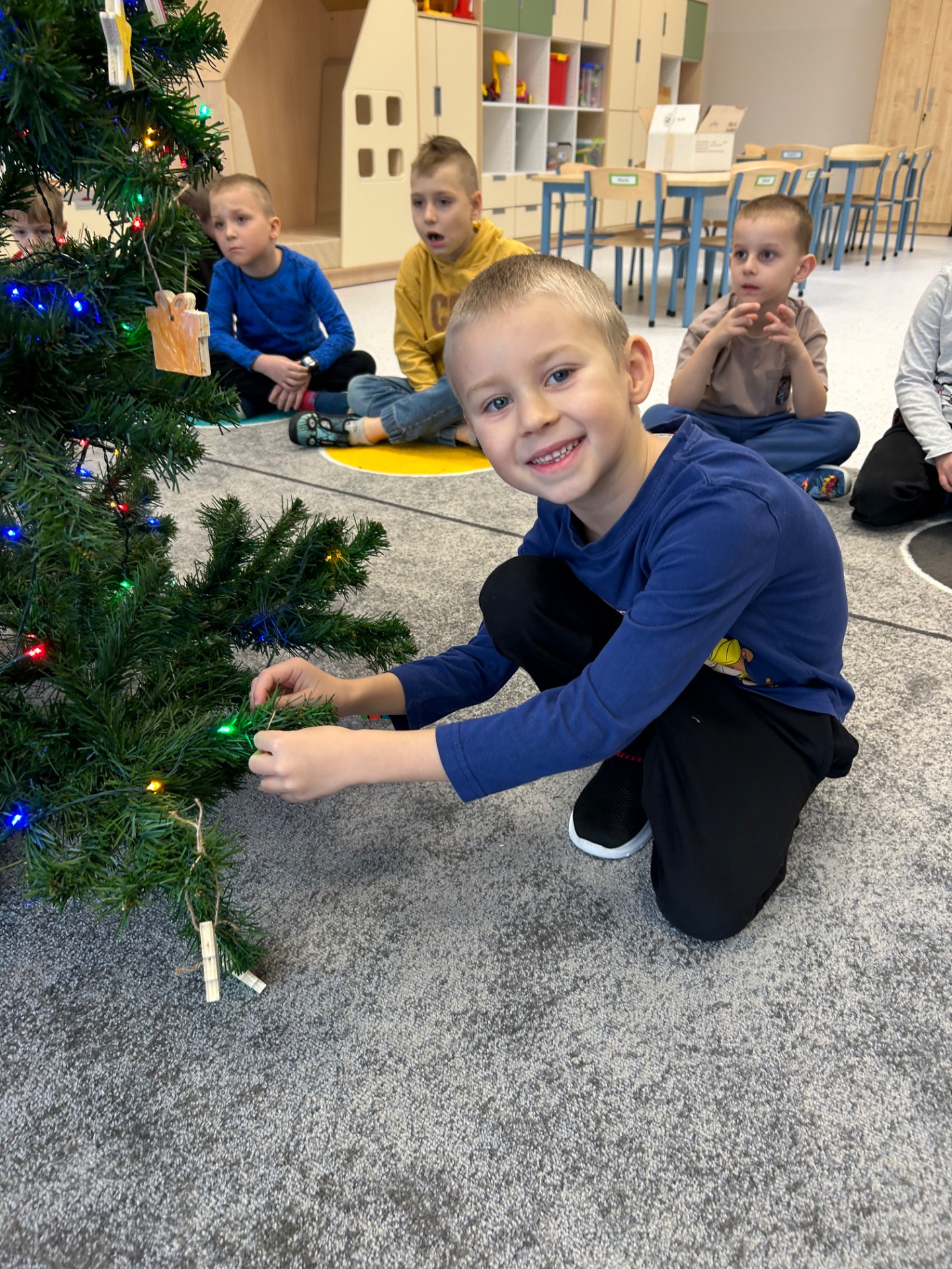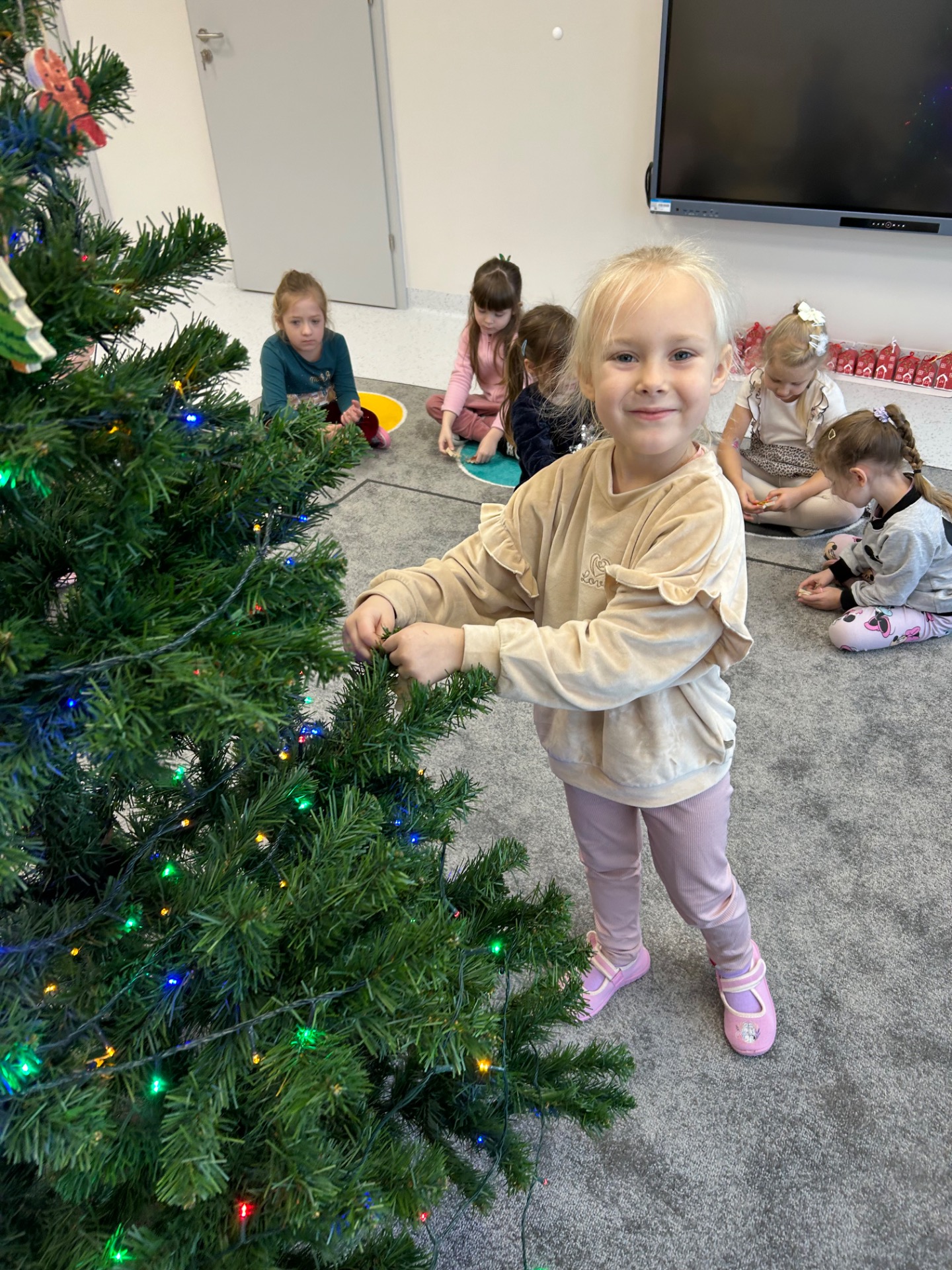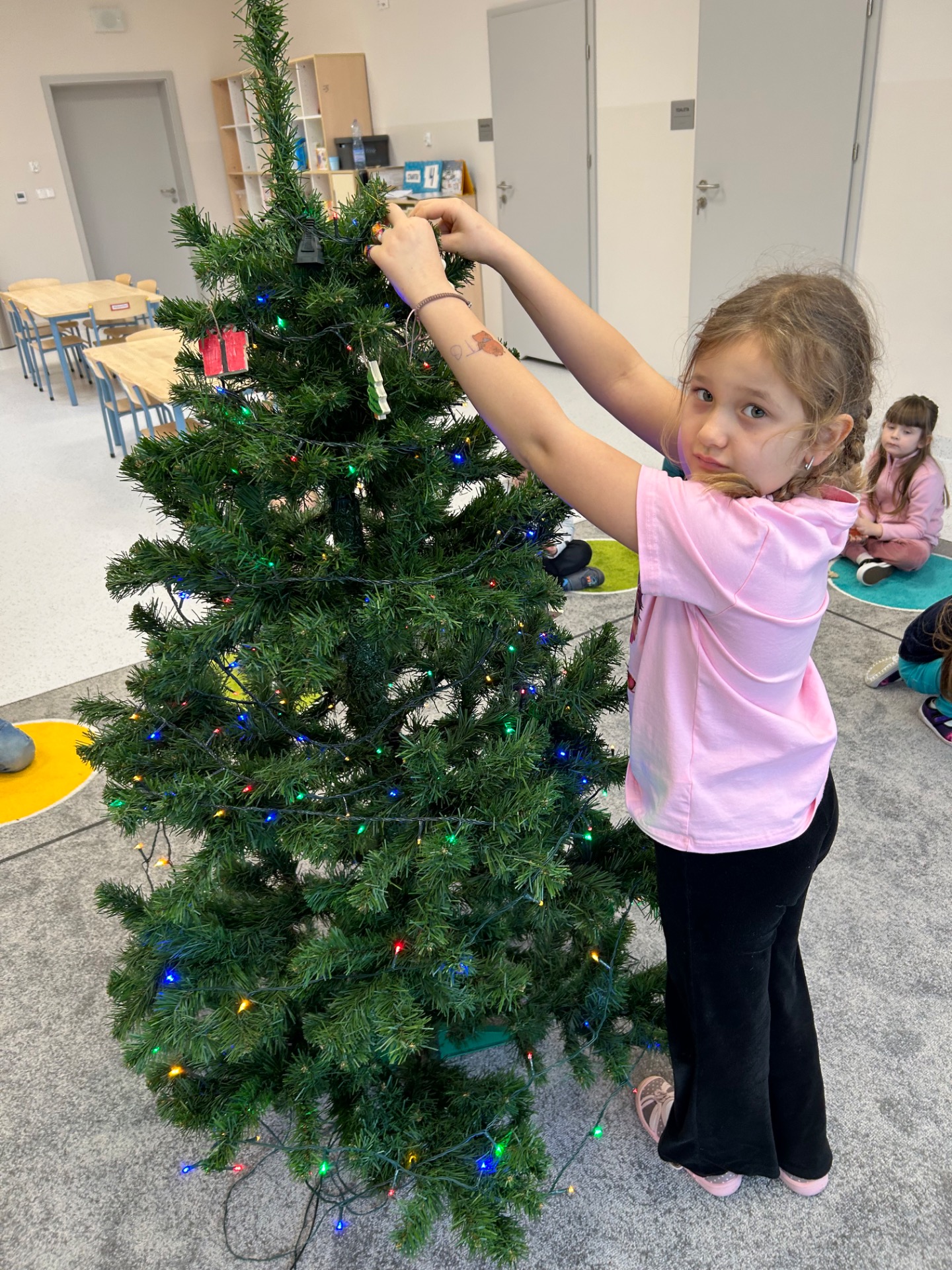 Z okazji zbliżających się Świąt Bożego Narodzenia nasza grupa starszaków z wielką radością przystąpiła do ubierania choinki. Dzieci samodzielnie zawieszały własnoręcznie wykonane ozdoby, tworząc wyjątkową, świąteczną atmosferę.