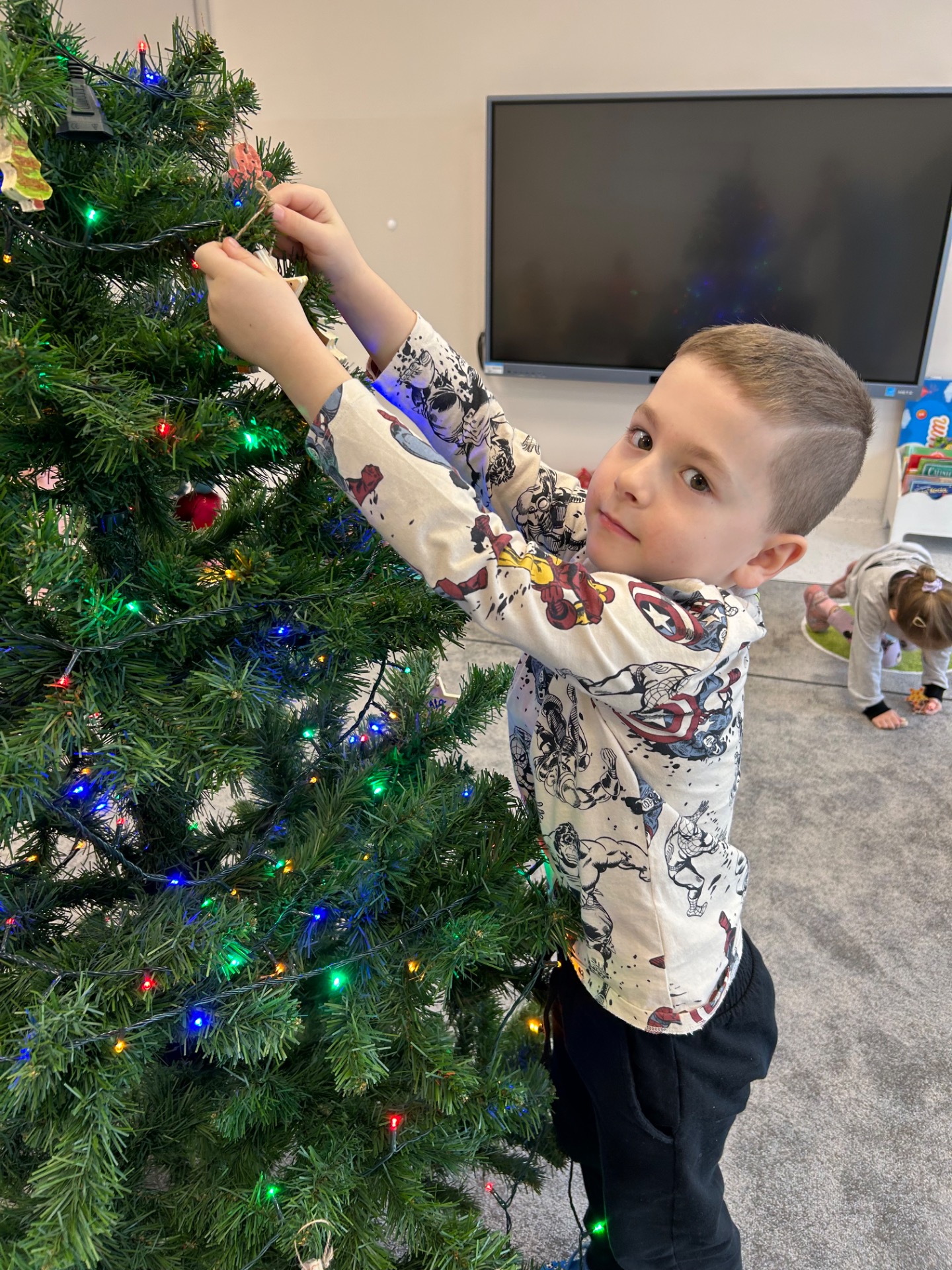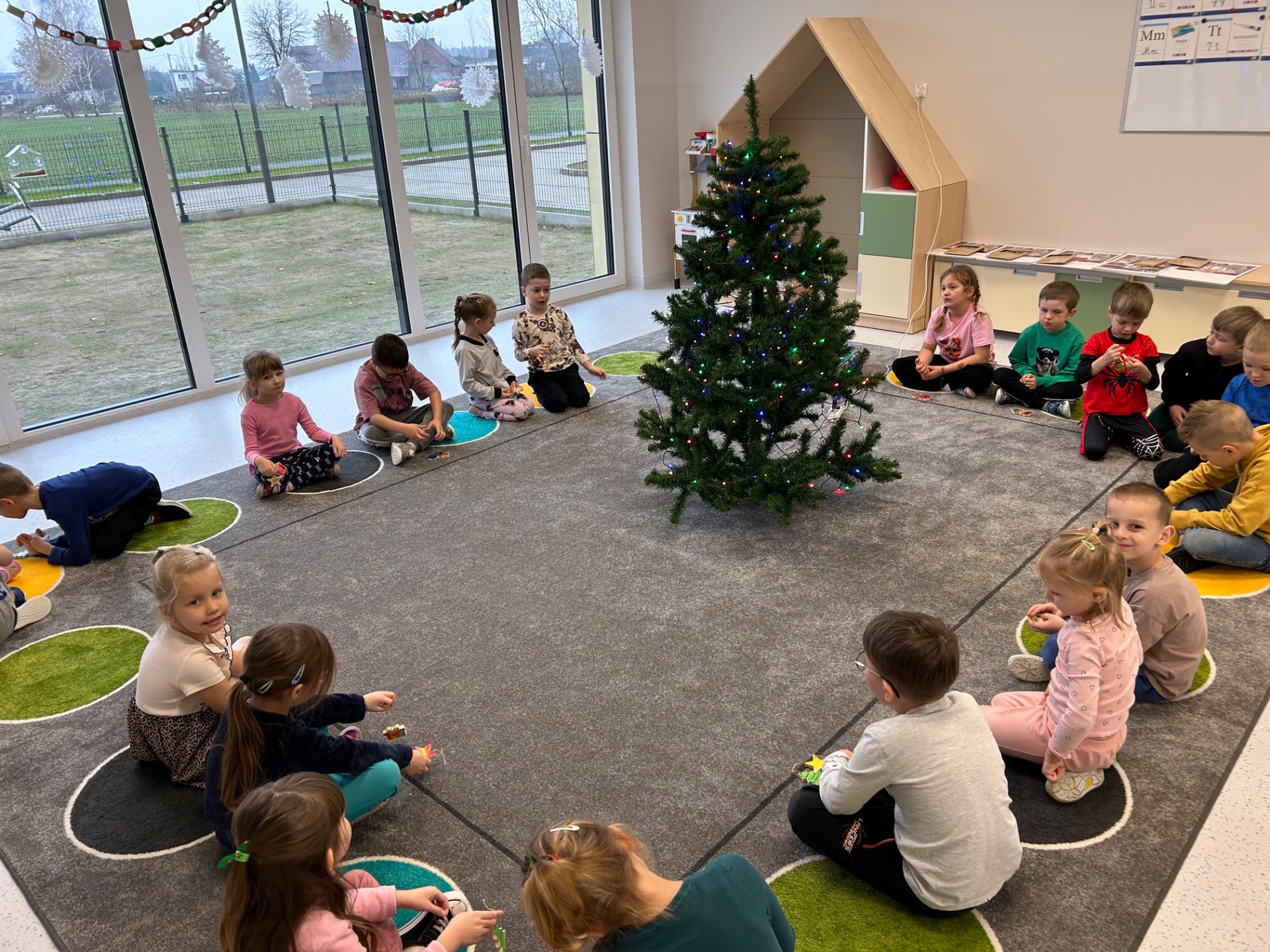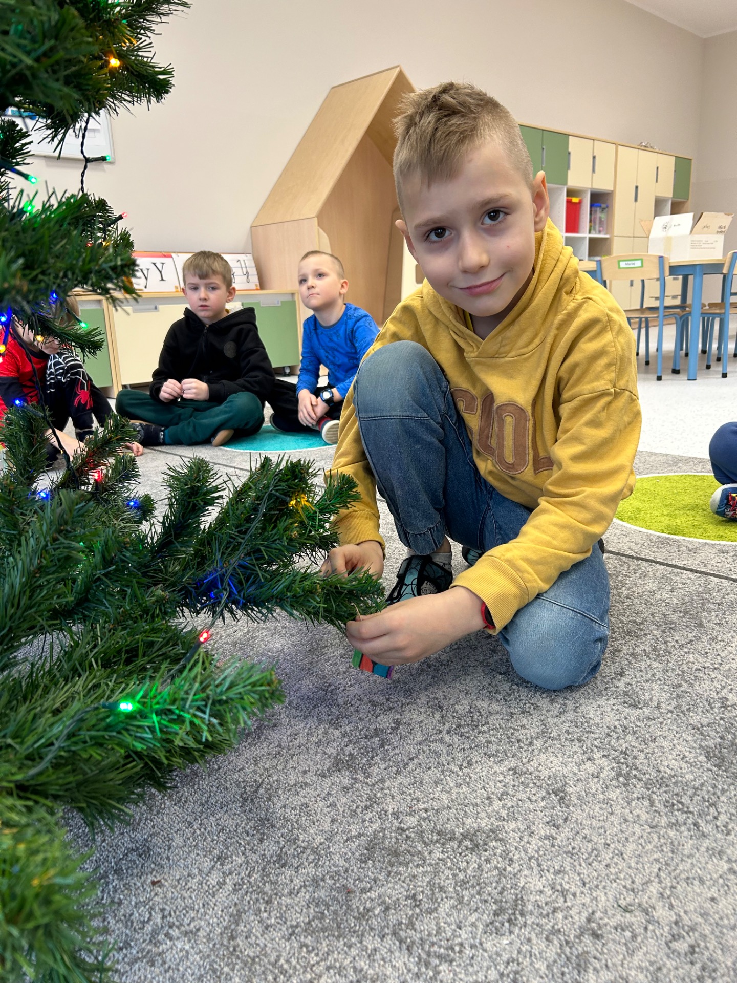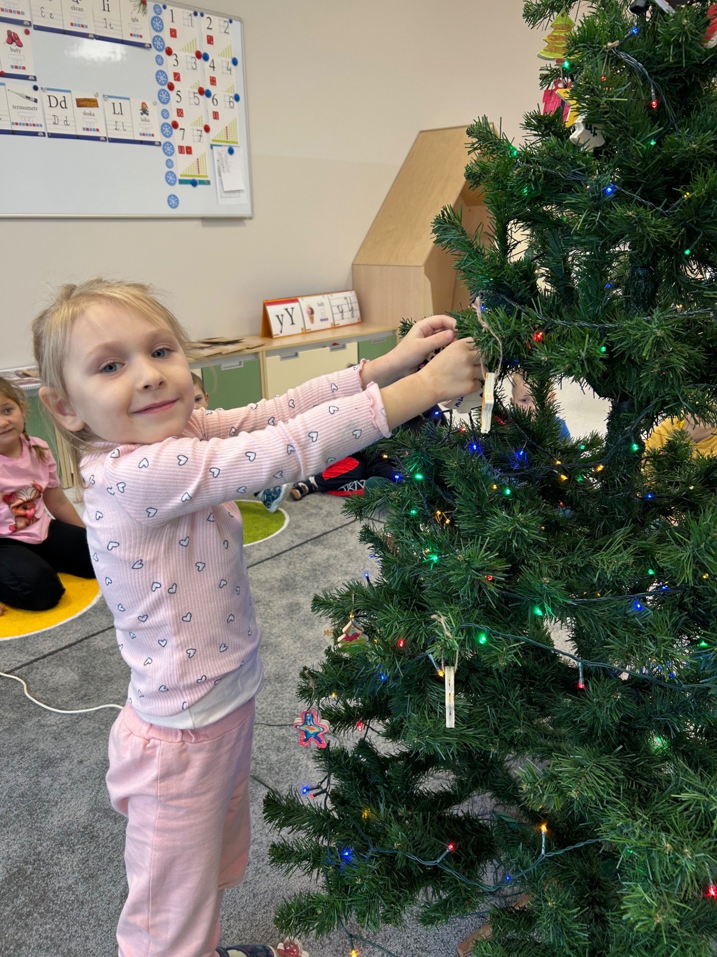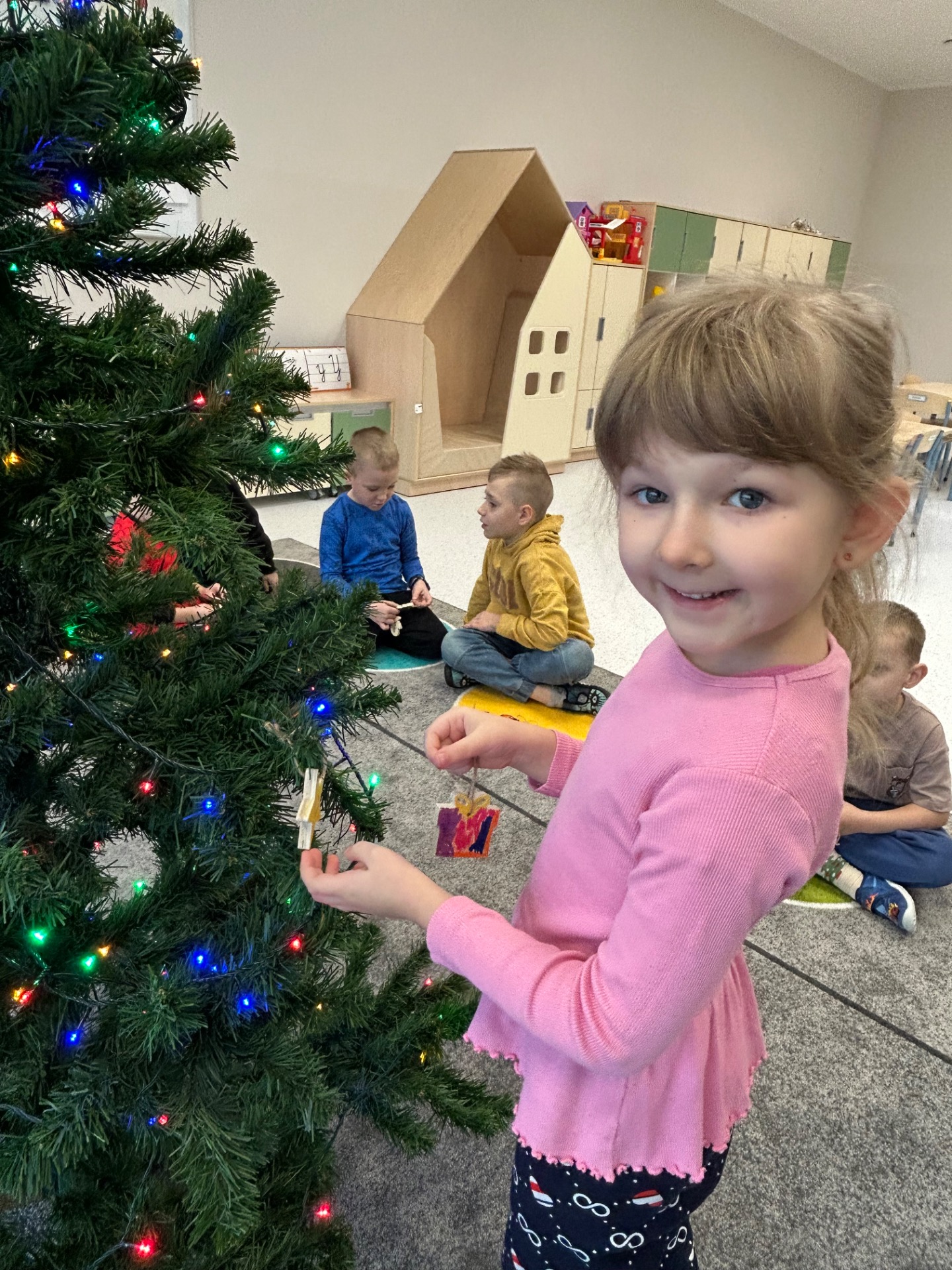 Z okazji zbliżających się Świąt Bożego Narodzenia nasza grupa starszaków z wielką radością przystąpiła do ubierania choinki. Dzieci samodzielnie zawieszały własnoręcznie wykonane ozdoby, tworząc wyjątkową, świąteczną atmosferę.