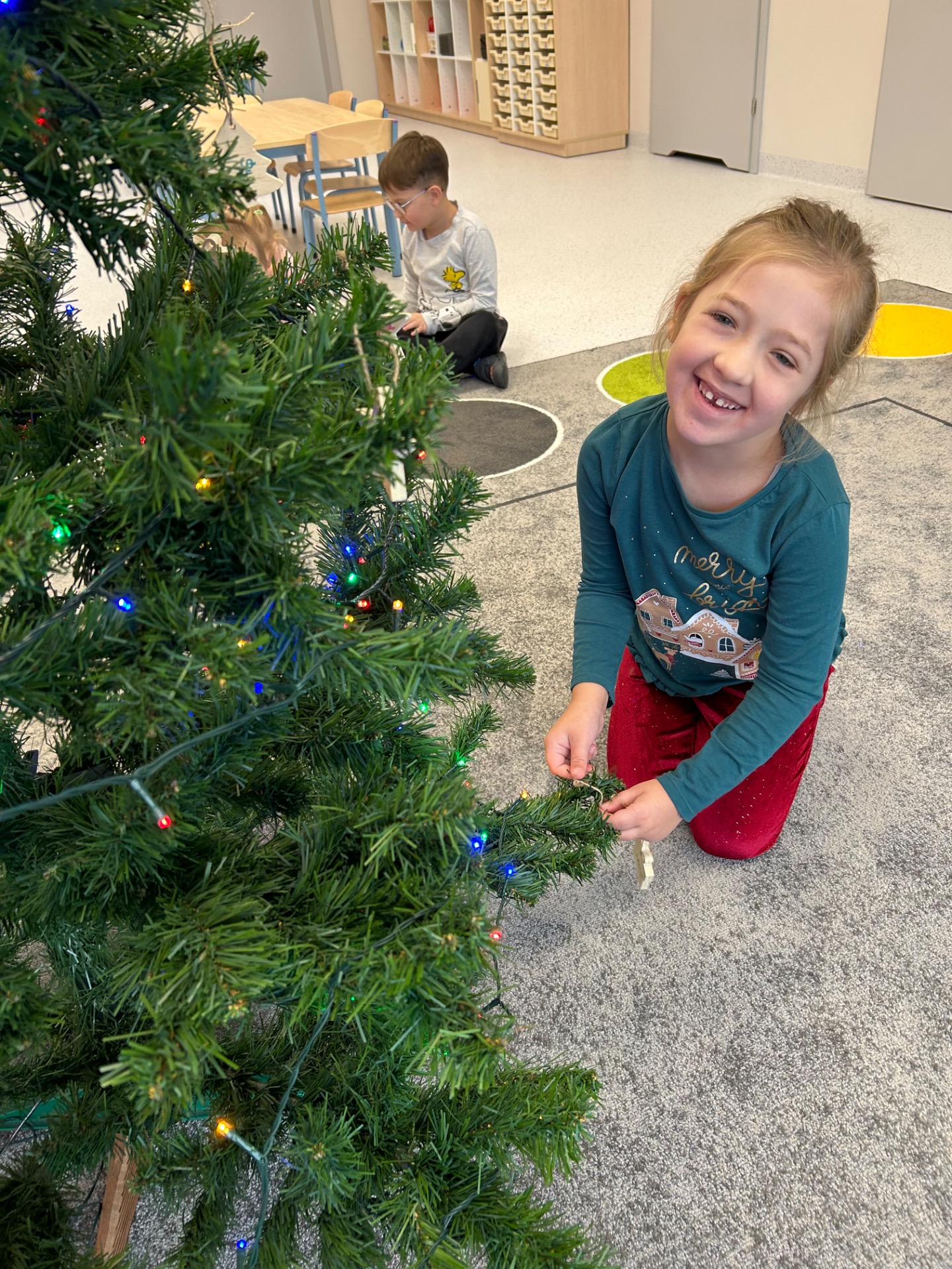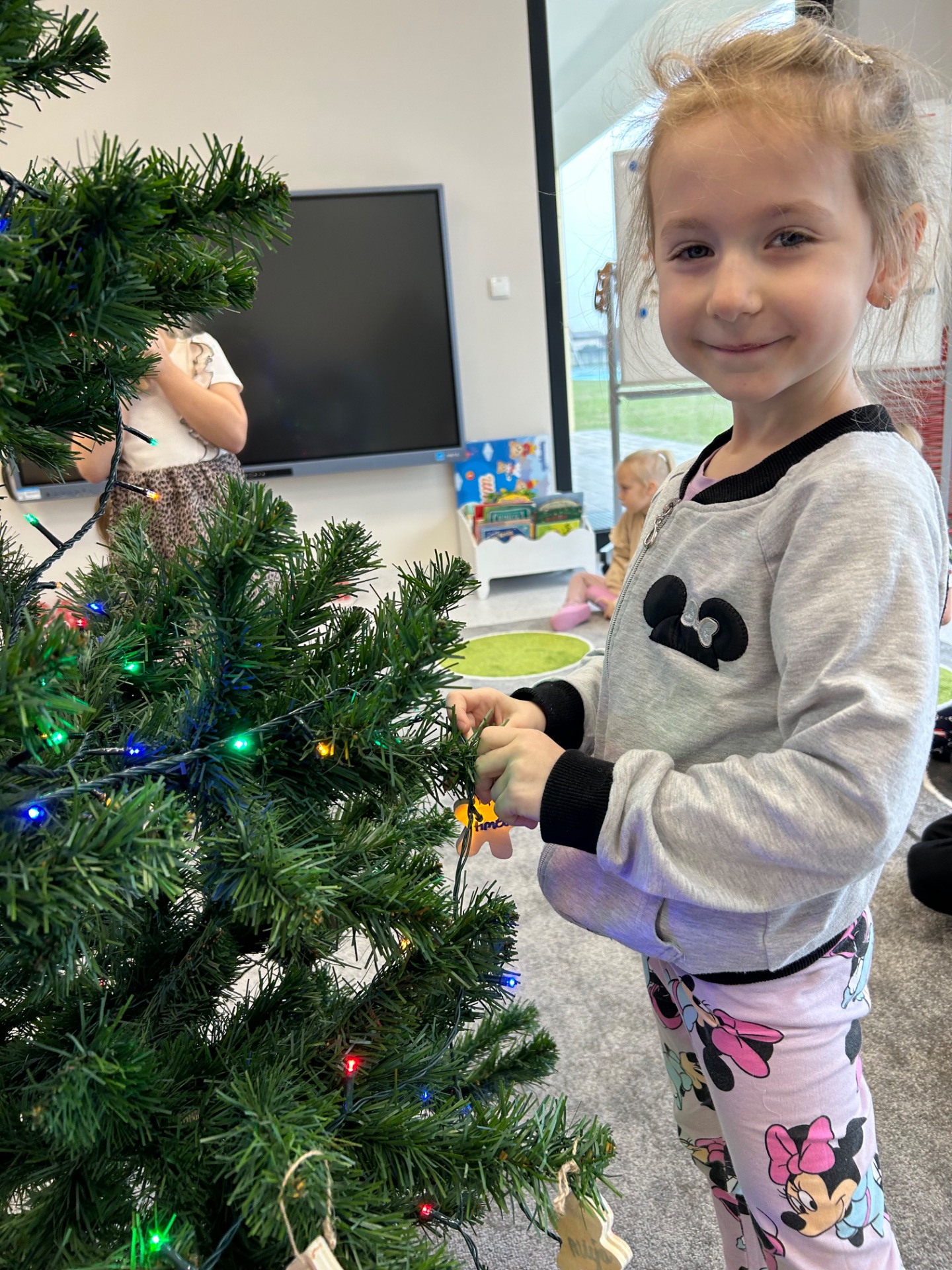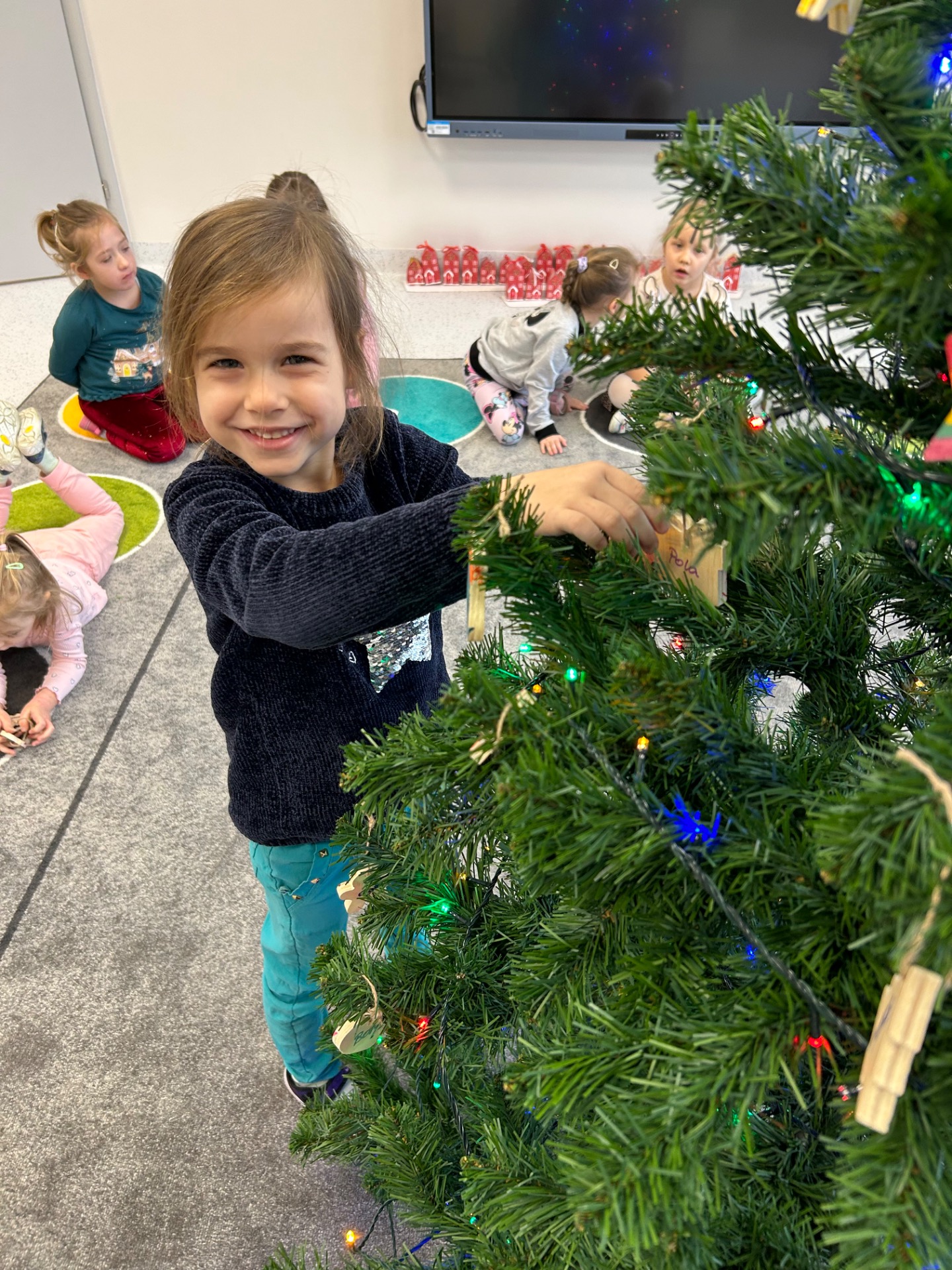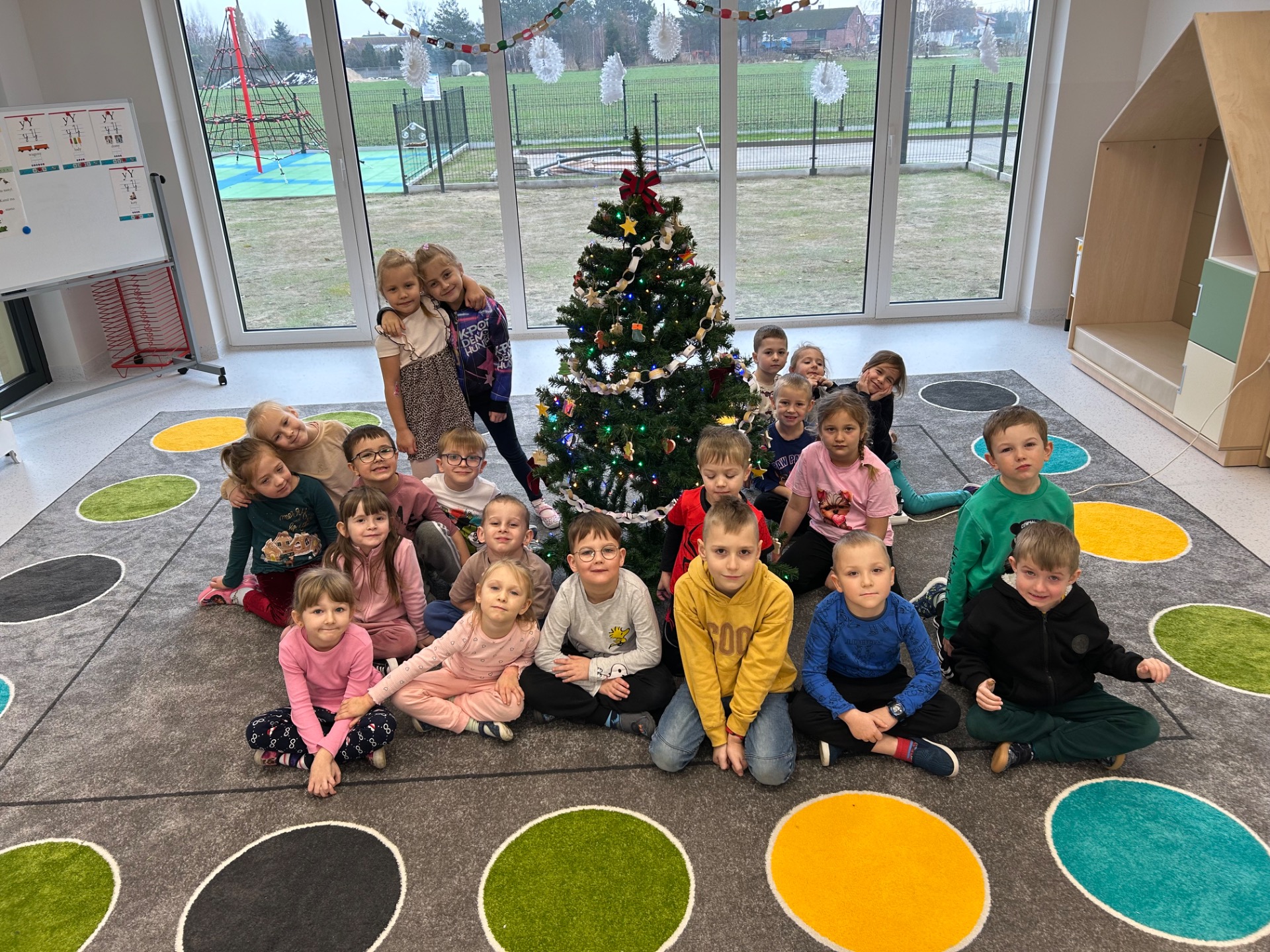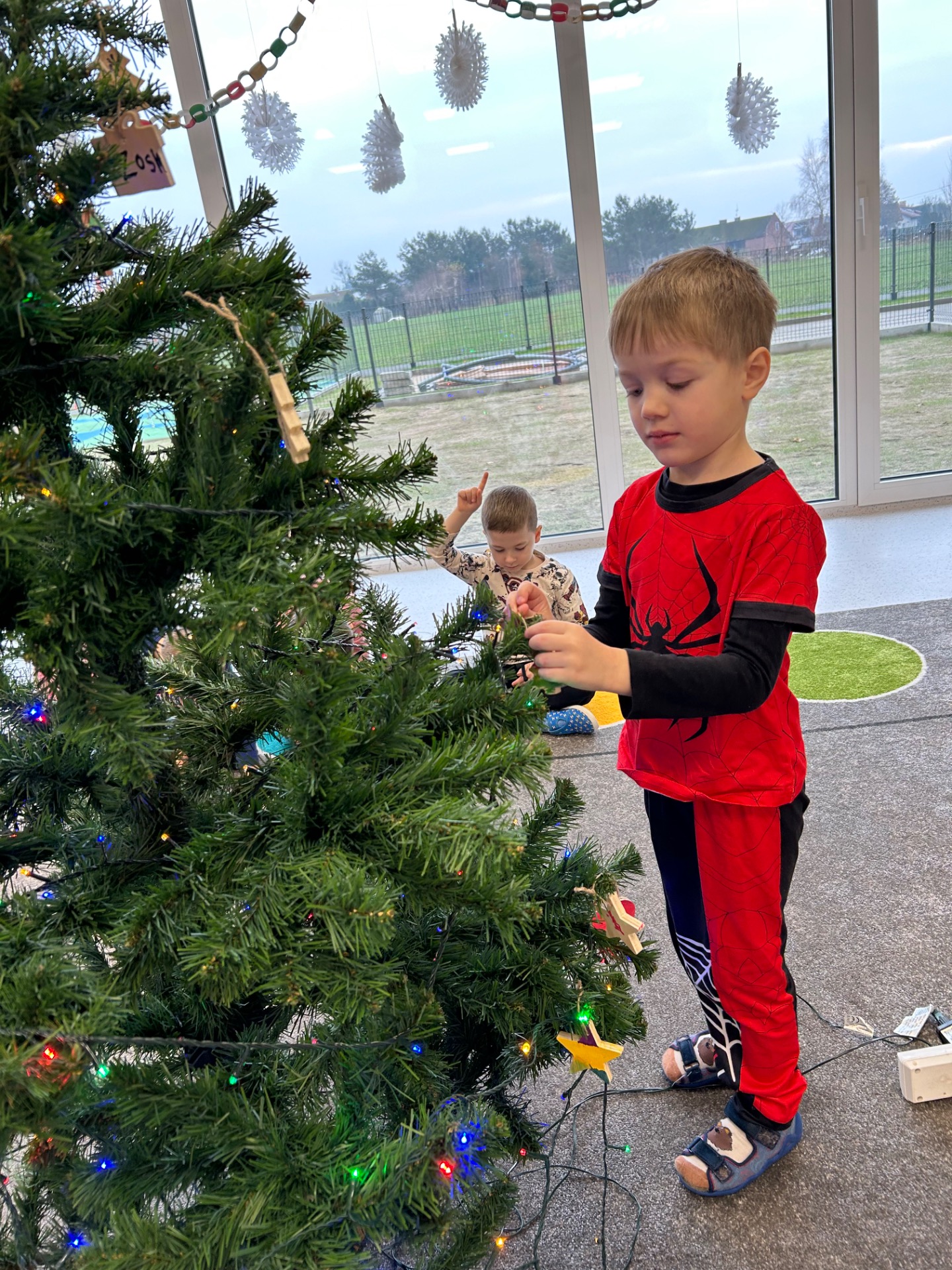 Z okazji zbliżających się Świąt Bożego Narodzenia nasza grupa starszaków z wielką radością przystąpiła do ubierania choinki. Dzieci samodzielnie zawieszały własnoręcznie wykonane ozdoby, tworząc wyjątkową, świąteczną atmosferę.